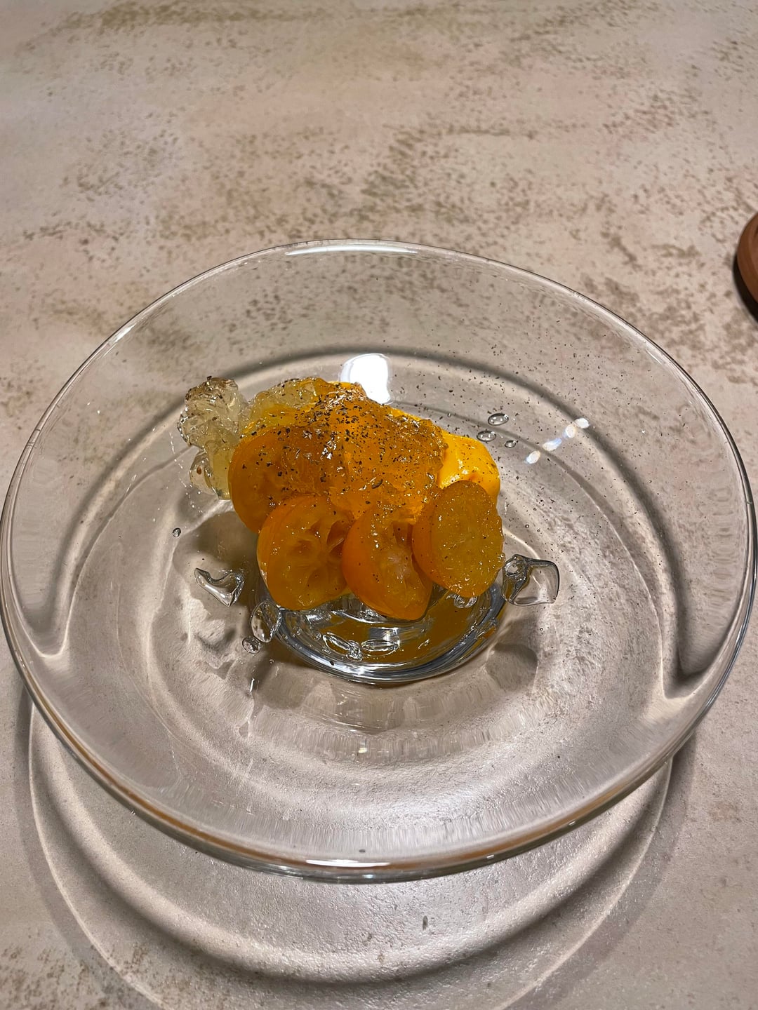 - Carrot mandarin creme dessert plus komquat plus ??? also komquat jelly plus mountain pepper from Indonesia. It was a very komquat dessert, and it was very refreshing.