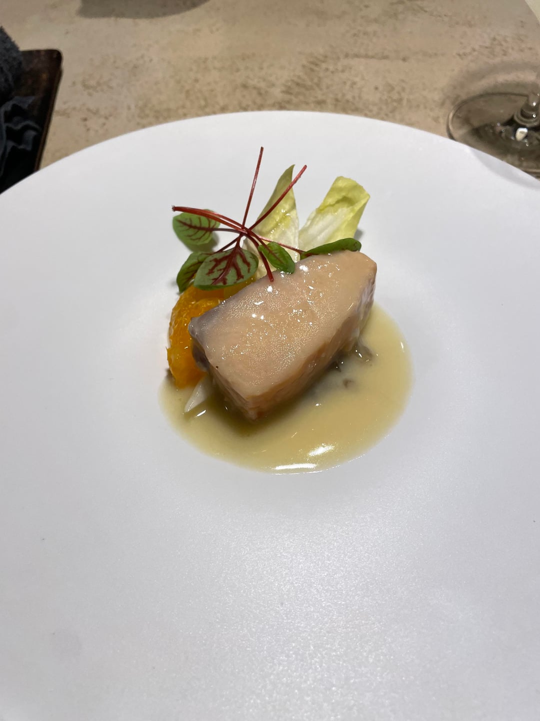 - Salmon from Tasmania and Japanese mandarin and endive, with sauce made from yellow wine