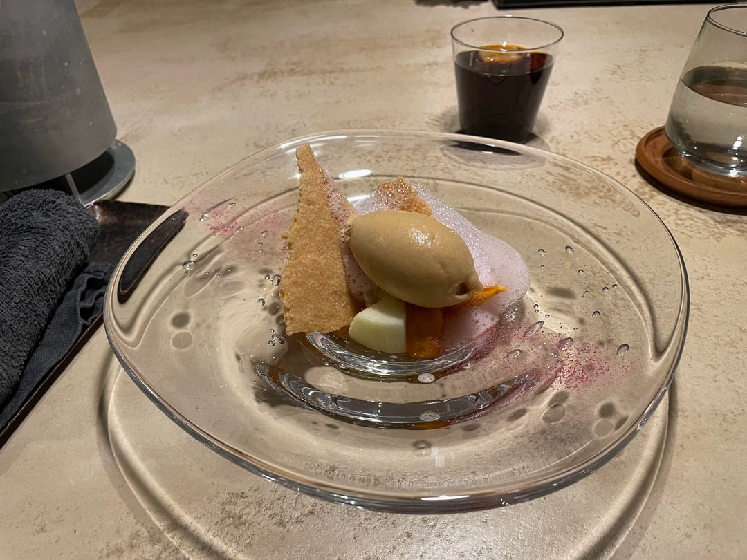 - A dessert inspired by caramel apple — mascarpone cheese at the bottom with both fresh apple piece and lightly cooked & seasoned apple piece and persimmon pieces. Sprinkled with cashews & cookie, Caramel apple ice creams on top. I have no idea what the foam was. It was a very fall dessert which was a little confusing because it was mid December, but delicious nonetheless.