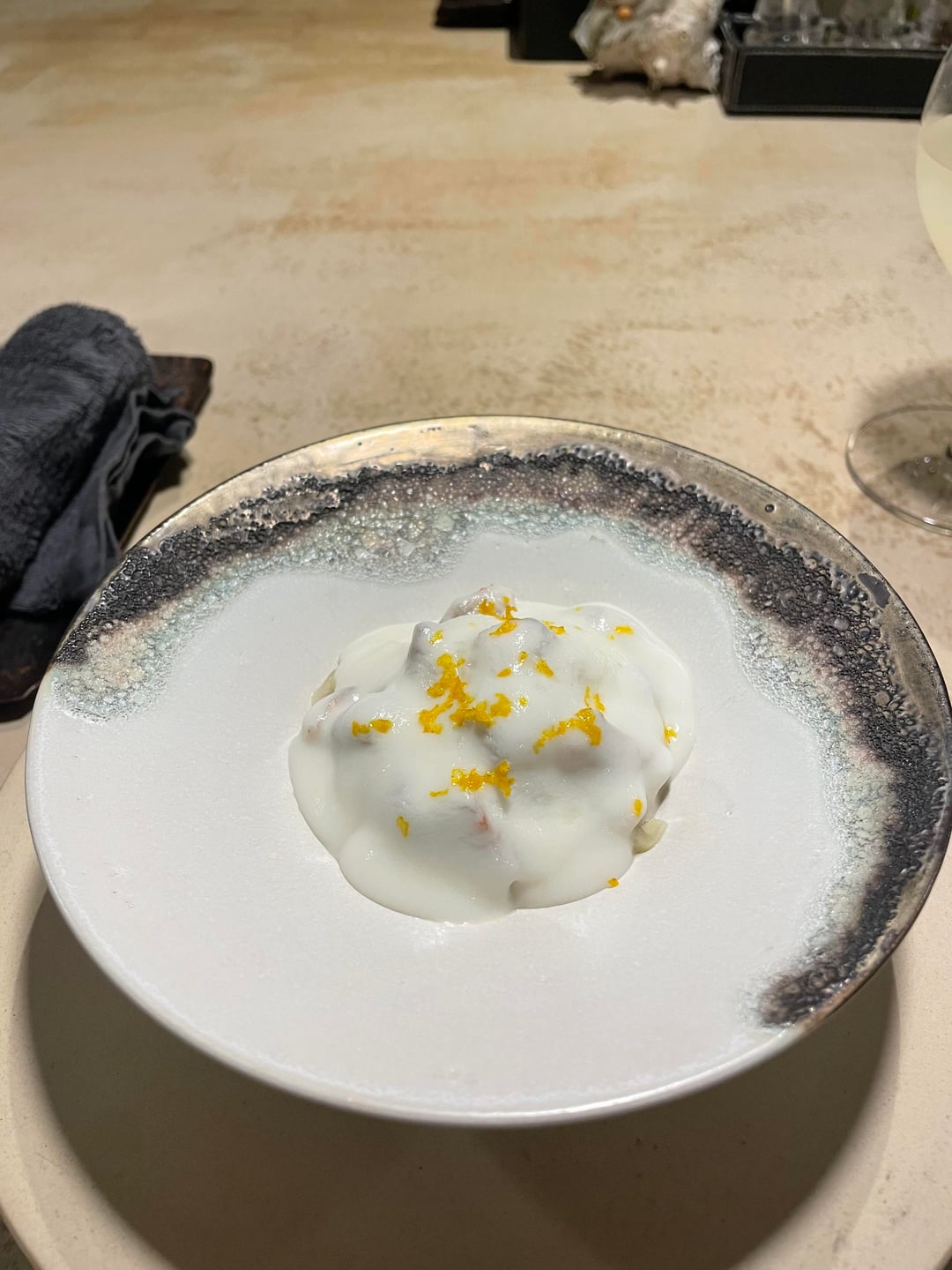 - turnip panna cotta and aburi Hokkaido shrimp and turnip sauce and mandarin zest. I really enjoyed how light this was.