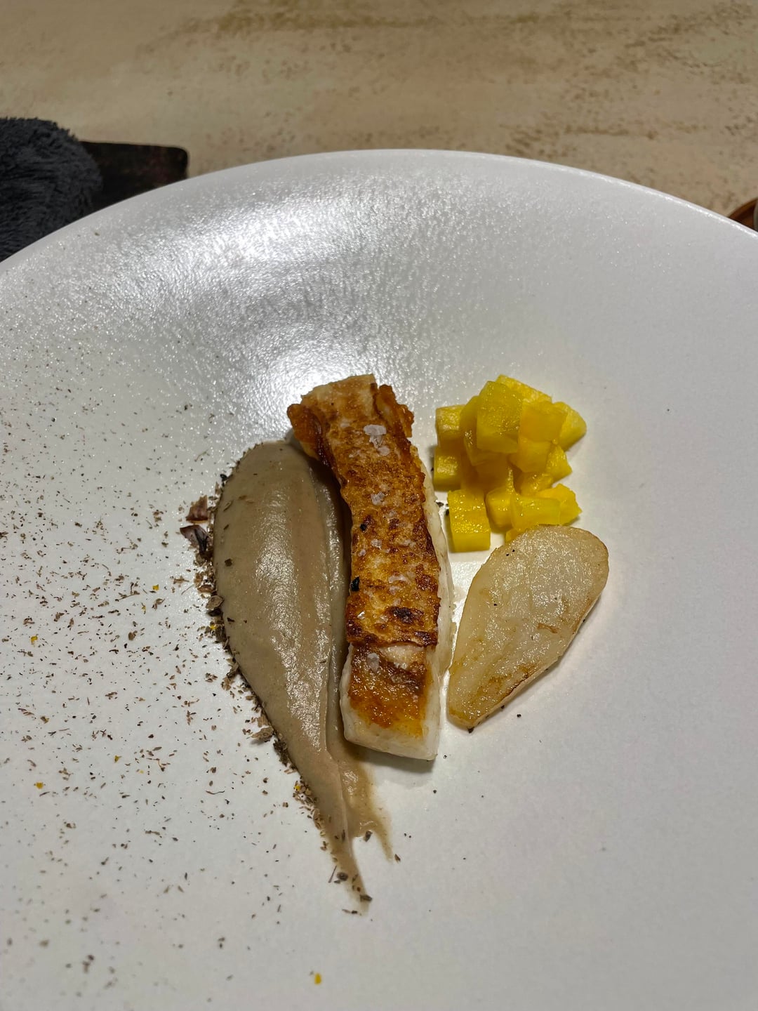 - Smoked butter and creme and fish stock sauce on lobster and abalone with sweet potato on top. At this point I was getting pretty full.