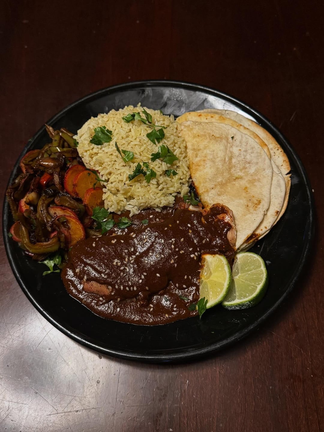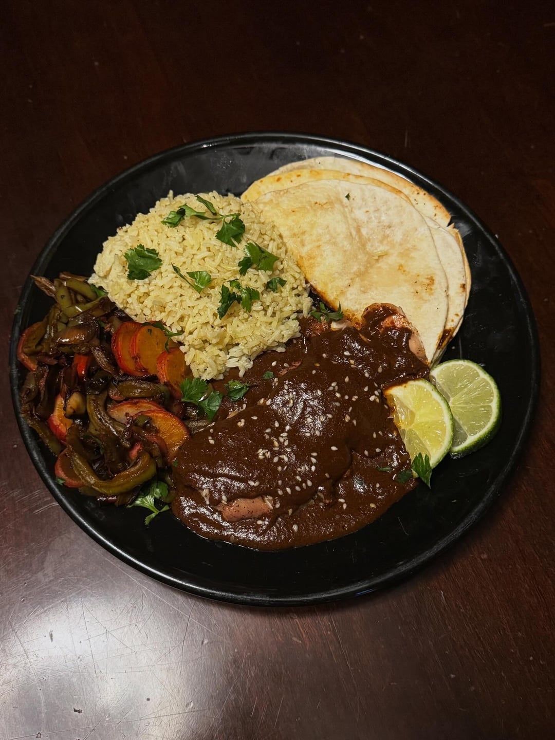 Here is the Mole everyone helped me with! Mole de pollo with garlic rice, tortillas, and some stir fried nopalitos. Holy hell is it amazing. Thank you to everyone! I made this for my wife and I on our 12 year wedding anniversary. We both love it.