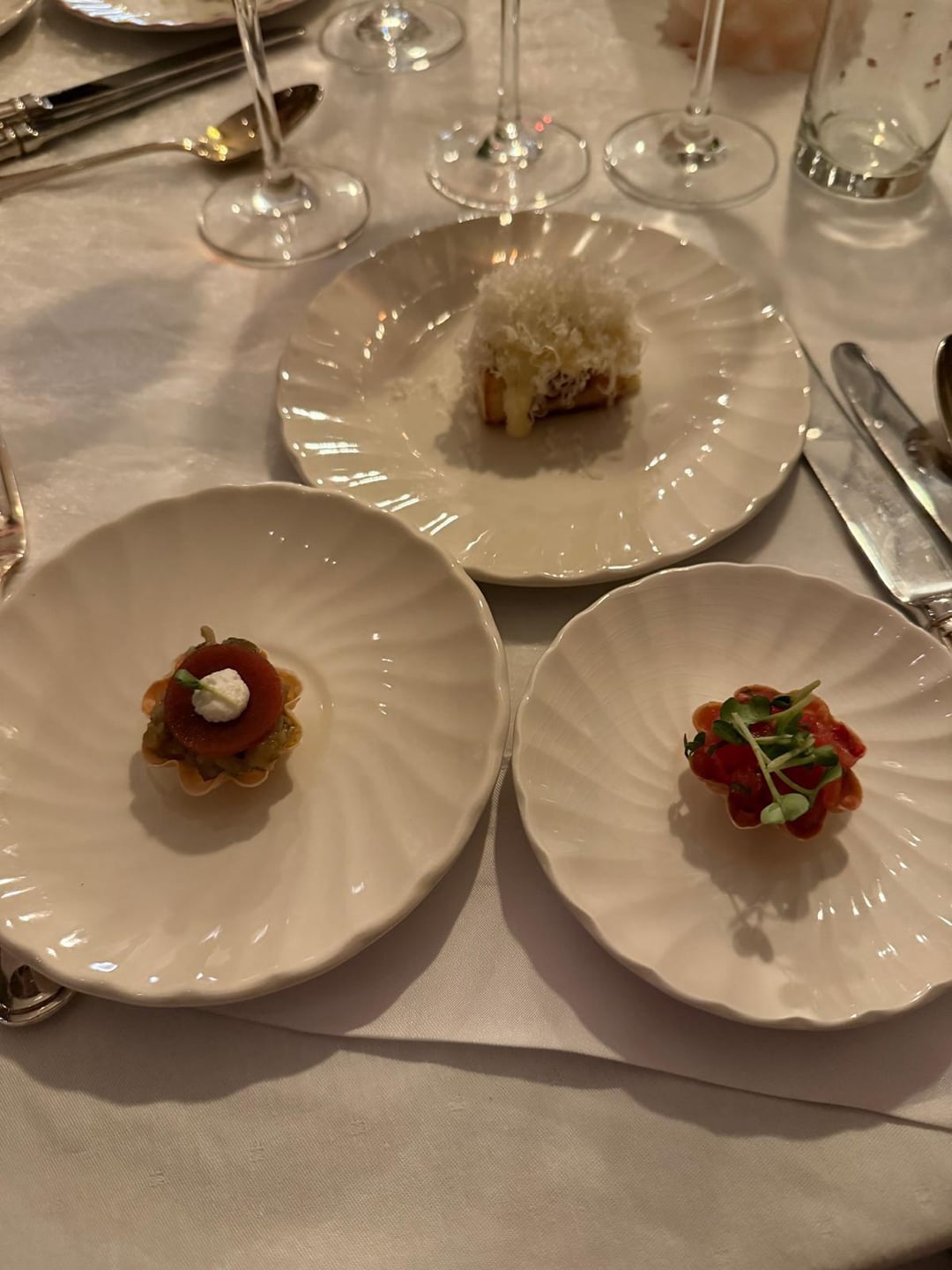 - a Tartelette with aubergine caviar, crème fraiche, capers, and a plum jelly on top