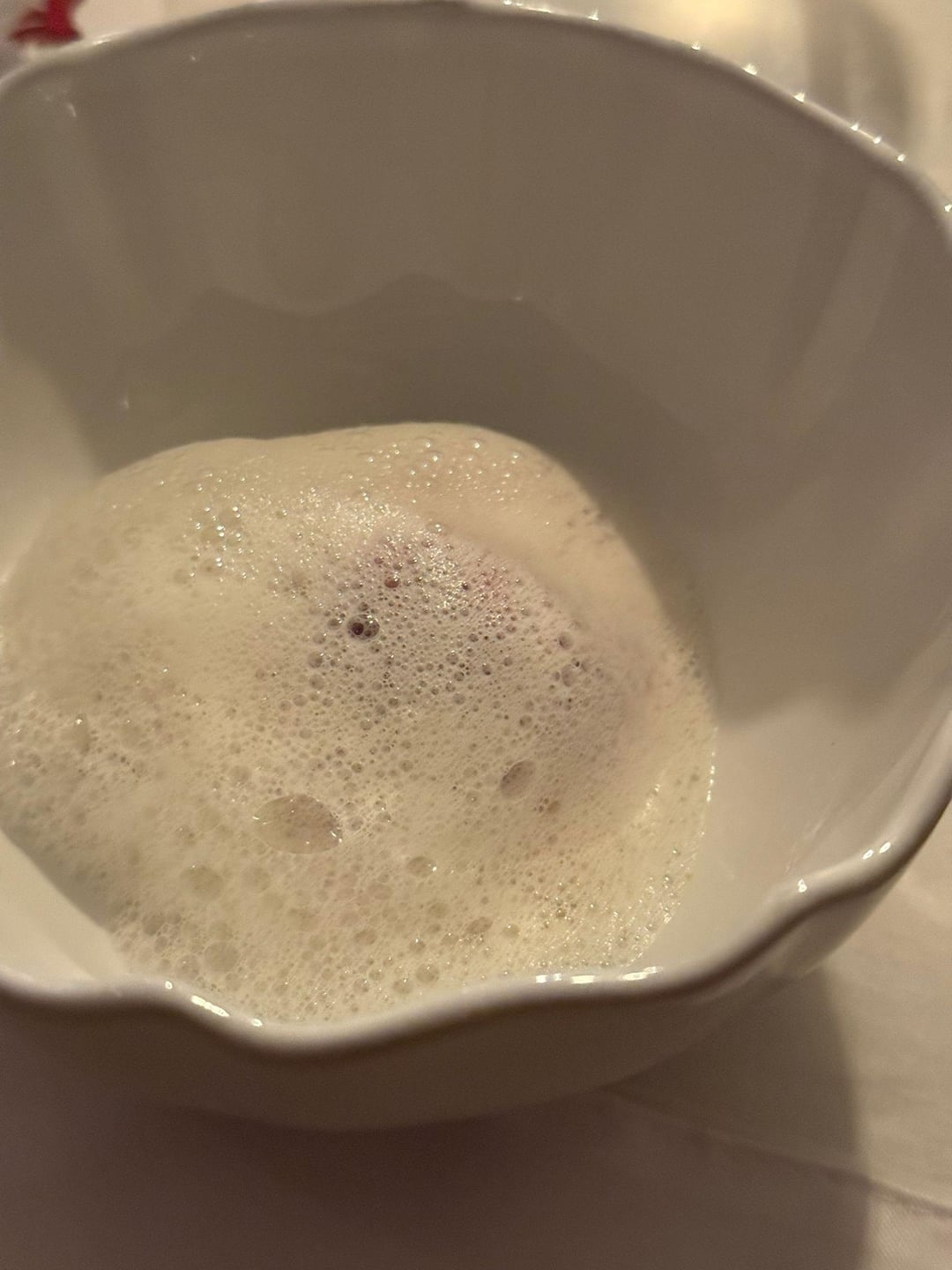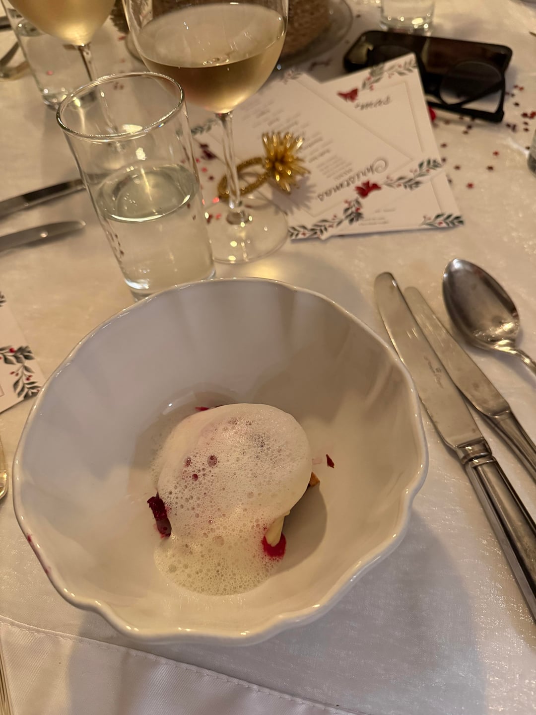 - on the bottom is a beetroot salad with roasted almonds and potato crisps. On top is a espuma of potato. On top of that is a sorbet of beetroot, and finished with a foam of parmezan cheese.