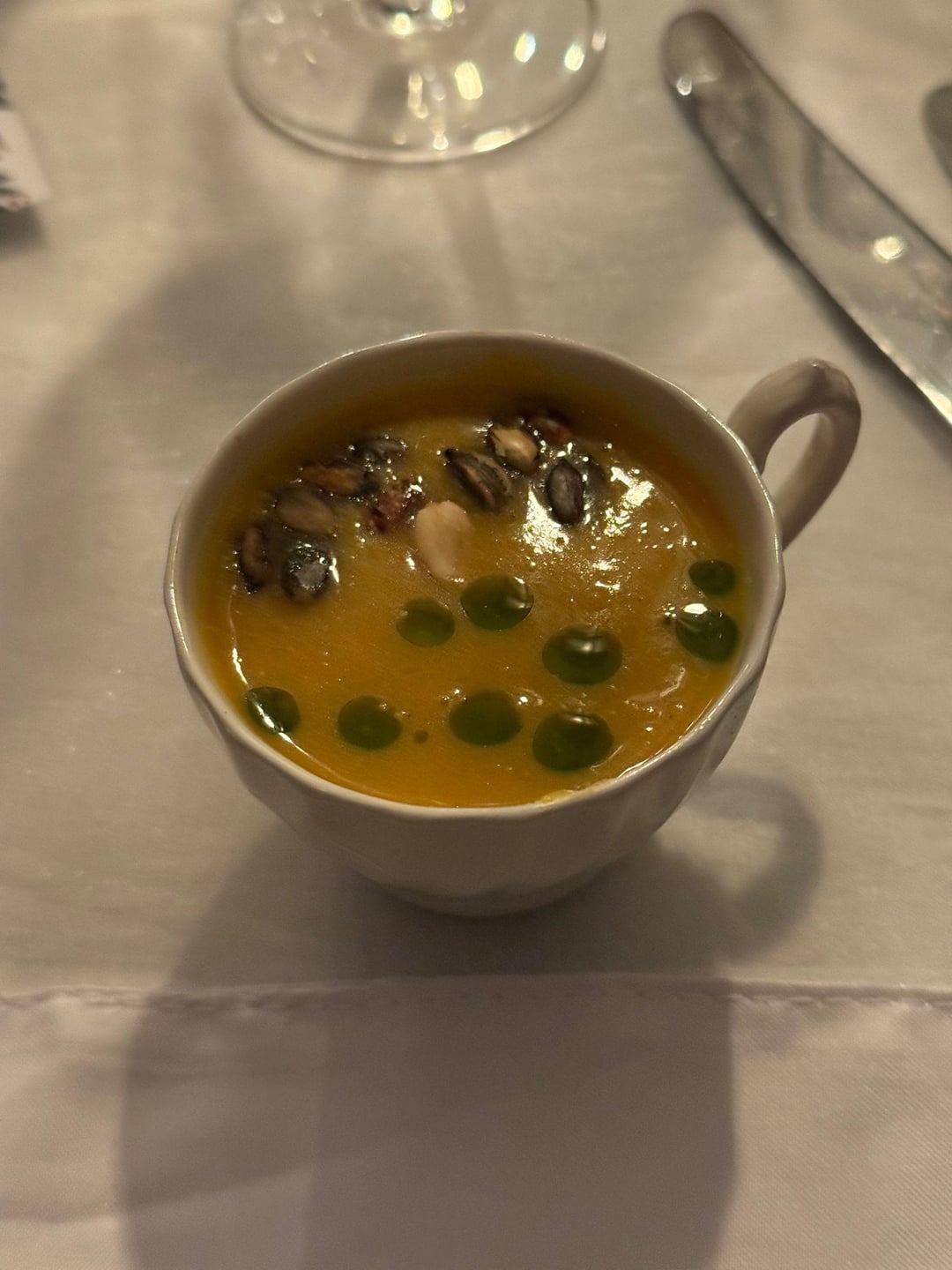 -simple pumpkin soup with roasted pumpkin seeds and chive oil.