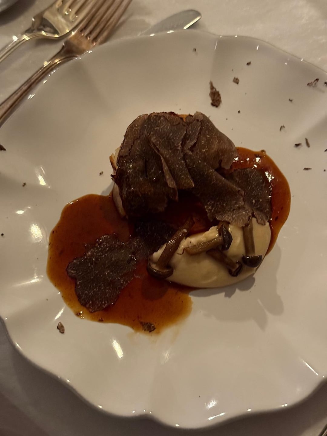 -roll of celeriac, a purree of celeriac, and grilled mushrooms. Sauce is a jus made from the trimmings of all the celeriac and finished on top is shaved black winter truffle.