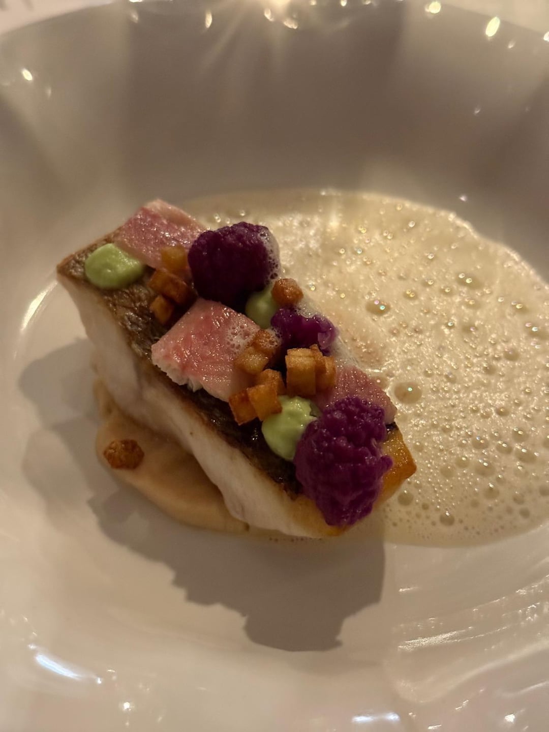 -sea bass grilled on the skin. Sitting on a puree of cauliflower. On top is smoked eel and purple cauliflower. And finished with a sauce of champagne.