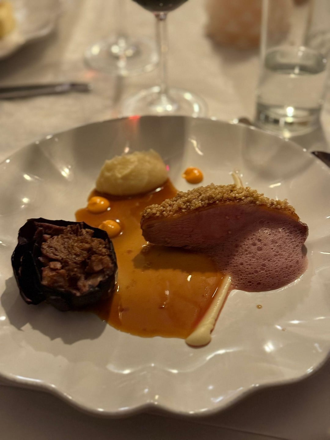 -pan seared duck breast with a crust of quinoa and ‘nduja. A puree of parsnip, a package of cauliflower filled with duck leg confit (the package fell apart after reheating🥲) a mayo of nduja, foam of red cabbage and finished with a duck jus!