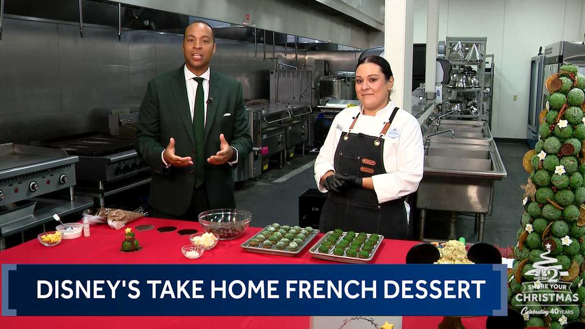We showed you the behind the scenes look on how much Walt Disney World does for Second Harvest Food Bank, including the unused food every single night. They make sure it gets on the tables across Central Florida. Let’s bring in Chef Jocelyn right now from Amaret’s Patisserie. You guys also have some creations behind the scenes that people can take part in if they visit the parks. What are we making today? So today we’re making *** little bit of *** take home version of *** traditional croquembouche. So at Amaret’s Patisserie we have ***, *** very small Christmas tree croquembouche. In France, traditionally, croquembouche is made for the holidays, especially for weddings, so we have *** really large one on display as an example here. But at Ammarrith Patisserie we wanna make *** small one so you can take it home and have it with the family. All right, let’s, let’s walk through this because obviously we’re doing Share your Christmas in *** number of ways, and this is *** way that you can share your Christmas at home. Tell us what we got right here. So we have. Couple of ingredients to get this made today. First we have profiteroles. So profiteroles are also known as cream puffs. They’re smaller versions. Um, we get this made with *** bunch of egg flour and sugar, cook that over the pot, add some eggs to it, bake it in the oven, and it puffs up, and then we get that nice little green color from it. So then we have. Our ingredient to kind of put everything together is our soft ganache. It’s *** nice milk and dark chocolate ganache. It’s gonna be the glue that assembles everything in there to build it. Is this powdered sugar over top of it? Yes, so it’s actually part of the sugar to make it look like snow. We love *** good Christmas and we love *** good snowy tree, so we finish that off by dusting it and then we’ll actually move to the assembly part. We have in here, it’s *** hazelnut custard, also traditional flavor from France. We’ll take our little profiteroles and we’re actually just going to stuff them. So that way, ah, *** little goodness in the middle. Every bite gets *** full tasting of that custard. And that way it’s also nice to share with the family and people, if they visit the park and visit the restaurant, they’ll be able to do this as well. Yes, they’ll be able to get one, take it home, and we actually love it because as we’re assembling it, it’s also easy to take it down that way. So instead of having the struggle of sharing *** dessert, you’ve got *** family fighting over everything, everybody can just take *** little piece for themselves so. It’s lovely. I love that part. So which one is this? This is our soft ganache that we talked about *** little bit, but before we get there, I actually want to show the fun part with our powdered sugar here. So after the kids will love, this is the part the kids love. After we get everything assembled and filled, we can go ahead and dust them, so it looks just like snow on top of these guys. And then. We have some already, ready to go. We’re going to assemble them now so we can build, build our tree. Start with *** little bit of *** dollop here. And this is the part where We love it, um, when we assemble it in the team. So then we’ll take this and we’ll kind of pipe along the side here. Almost resembles that. Branch part of *** tree Christmas tree nice and dark, finish it off up top. And then Just *** little bit of *** dollop here. And of course we of course it’s our Christmas tree so everything gets *** nice little star on top. I absolutely love this. Now this is an easy thing that we kind of put together. You guys do the hard work. We get to do the fun part of this, but you also have *** secret ingredient, don’t you? I do. Yeah, I have *** little secret ingredient coming around. Chef Mickey, come on in. Chef Mickey is the game planner for making all these creations come to life. How much is it *** magical experience to be at the park and be able to put all this together? Uh, it’s just something that’s so unique. We have so many different options at Amar Patisserie, especially for Mickey. We have our little, uh, character inspired domes for you over there, yeah, we love them. Ammar’s Patisserie has around 6 different character domes that we do throughout the year and also for the holidays, inspired by Mickey himself, of course, of course. Of course, all the fun that happens over at Ammarre Patisserie, you can join in by going over to Disney Springs. Thank you guys so much for all you do in the community, whether it’s giving back to share your Christmas or Second Harvest Food Bank or teaching families at home to be able to enjoy this experience on their own, you can make this own creation all by yourself by visiting the restaurant over at Disney Springs.