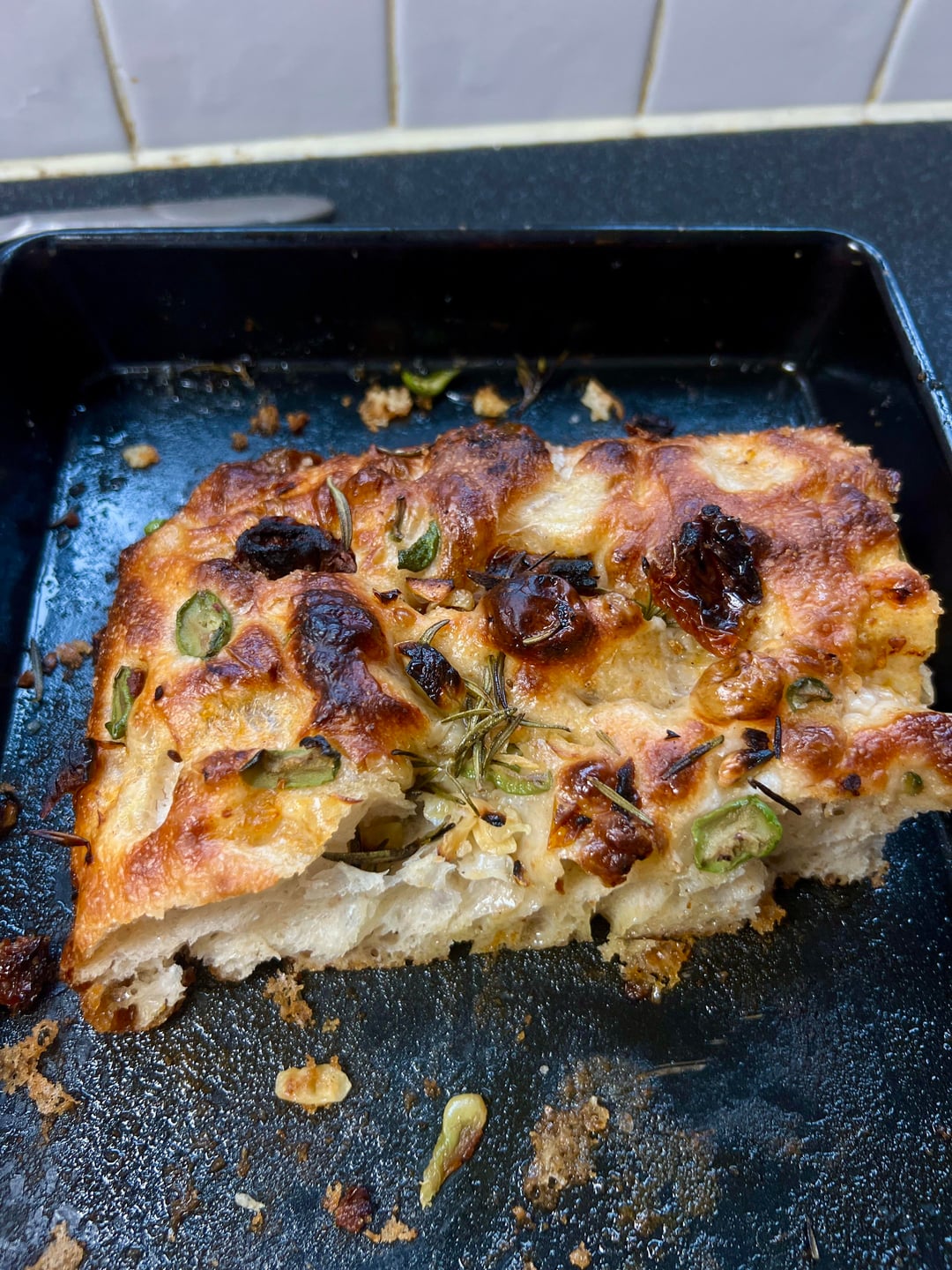 Topped with sun dried tomatoes, olives, rosemary. Baked super hard and the tomatoes caught a bit too much colour for my liking but overall pretty pleased with this one.