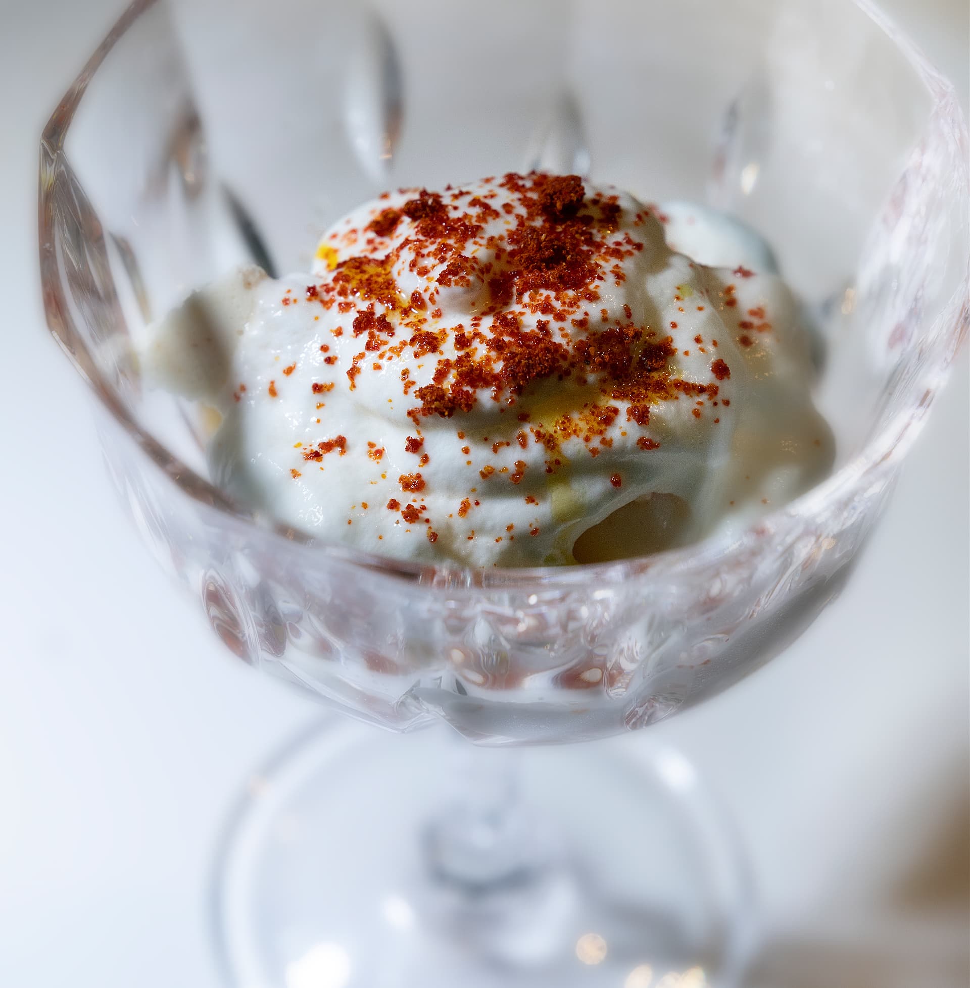 Top sirloin was cured for ten hours in a salt-and-sugar mixture with aromatic herbs, including marjoram, fennel, and dill. Finely hand-sliced, the beef was served as three individual bites, each finished with a different olive oil.