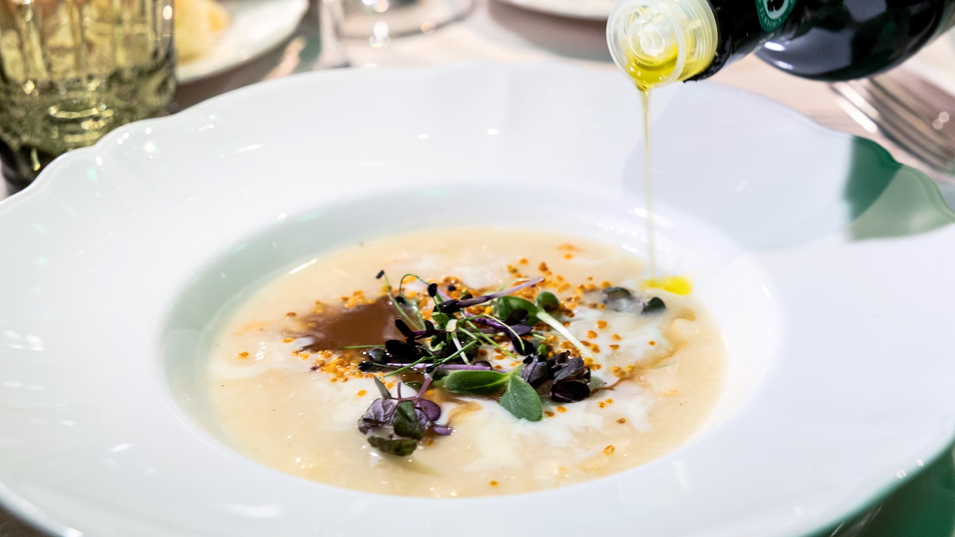 Celeriac faux risotto, its reduction, Galaverna fondue, and pollen by Chef Andrea Perini (Photo by Consorzio Olio DOP Chianti Classico)