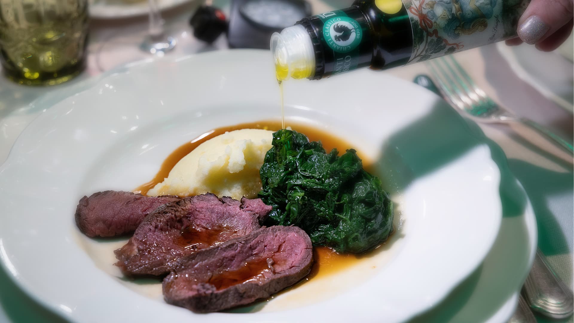 Fallow deer sirloin with borlotti bean purée and a baby spinach rollatina by Chef Andrea Perini (Photo by Consorzio Olio DOP Chianti Classico)