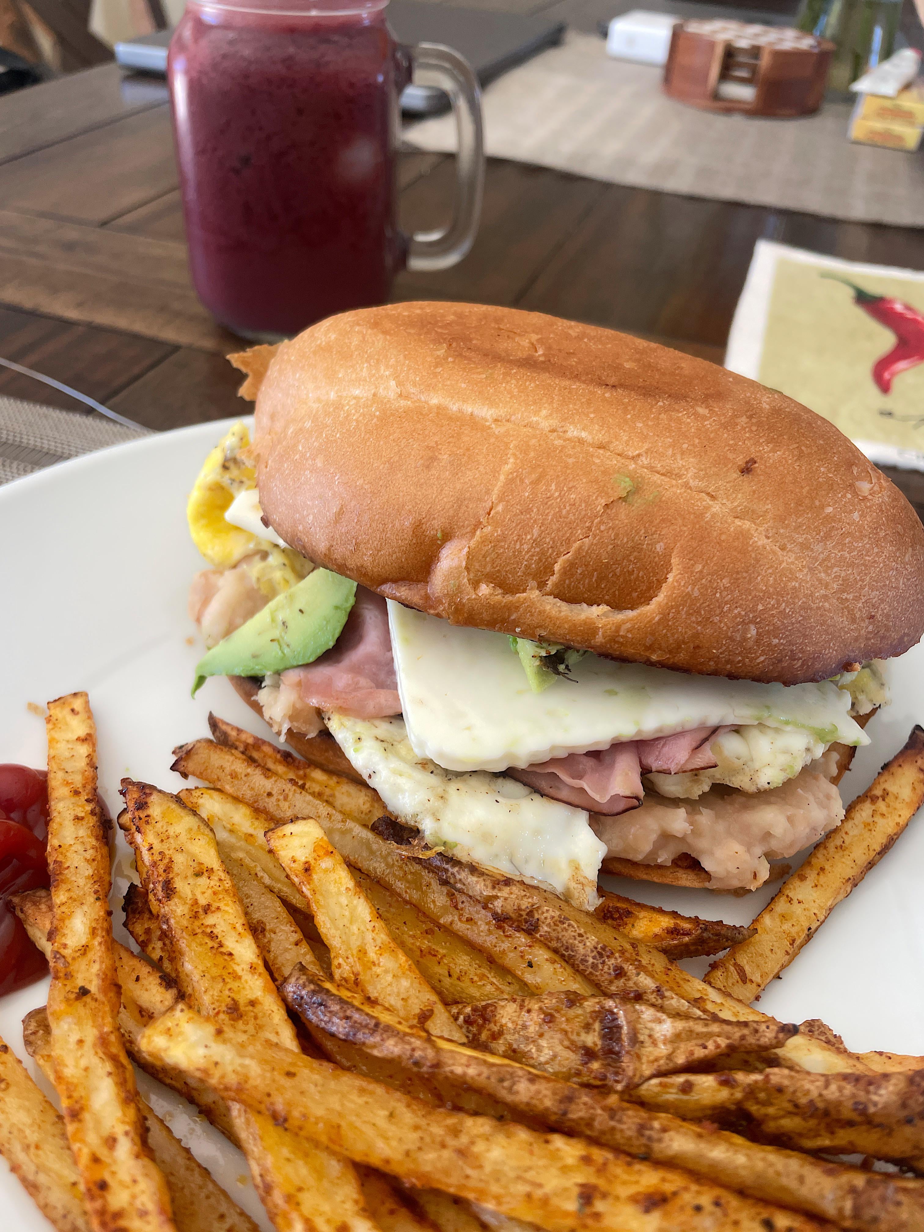 Pan telera, queso panela, frijoles refritos con chile serrano, aguacate, jamón, y huevo.Papas sazonadas con paprika, cayenne pepper, y sal de ajo.Jugo es de frutos rojos.by ozzy7221 4 Comments morbob 3 months ago Wow aaroncmenez 3 months ago Torta de huevo, así nada más Creative_Maize1379 3 months ago Estas malito!!🤣🤣 tinieblas01 3 months ago Looks awsome!