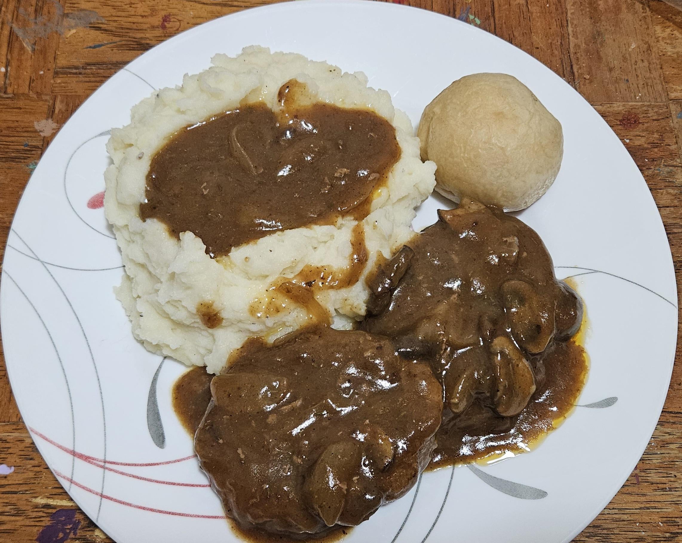 Total cost is around $13.25/6 servings, or approximately $2.20/serving. You could easily skip the beef stock, thyme, onions and/or mushrooms to save a little money, as well as any of the creole seasoning, Worcestershire or crystal sauces if you don't like cajun/creole flavors. If you skip the broth, leave the grease and make a roux with that, adding water to make the gravy (will give plenty of beefy flavor). You could also sub for ground turkey patties for lower cholesterol or just to avoid red meat. Lastly, you could skip the butter in the potatoes if need be. Most of the rest should be pantry staples (flour, milk, salt & pepper, etc.), and is easily scaled up or down, depending on your crowd.
