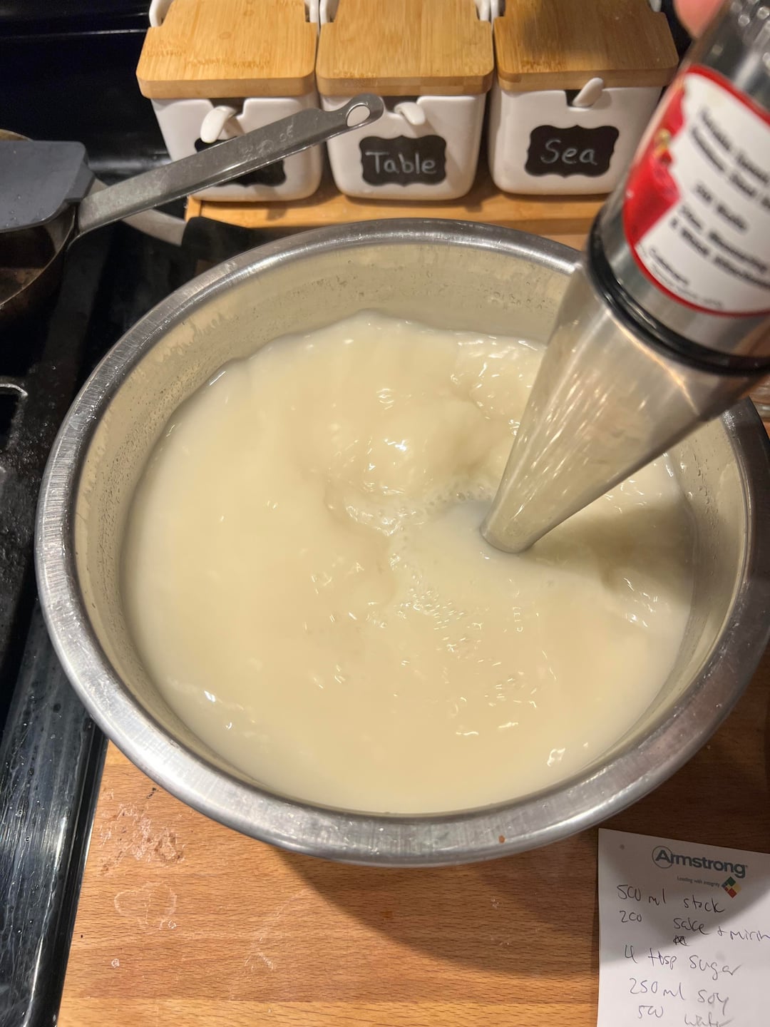 Made a large batch of chashu. Recipe called for simmering in water with aromatics and then simmer again in a separate sake/soy mixture. Tasted the initial cooking liquid and decided to make a broth with it instead of dumping it. Added hondashi, gelatin and mixed it with an immersion blender. Surprised it went from almost clear to white after blending. Used the leftover sake/soy mixture to marinate eggs. Reduced same liquid to use as a tare.