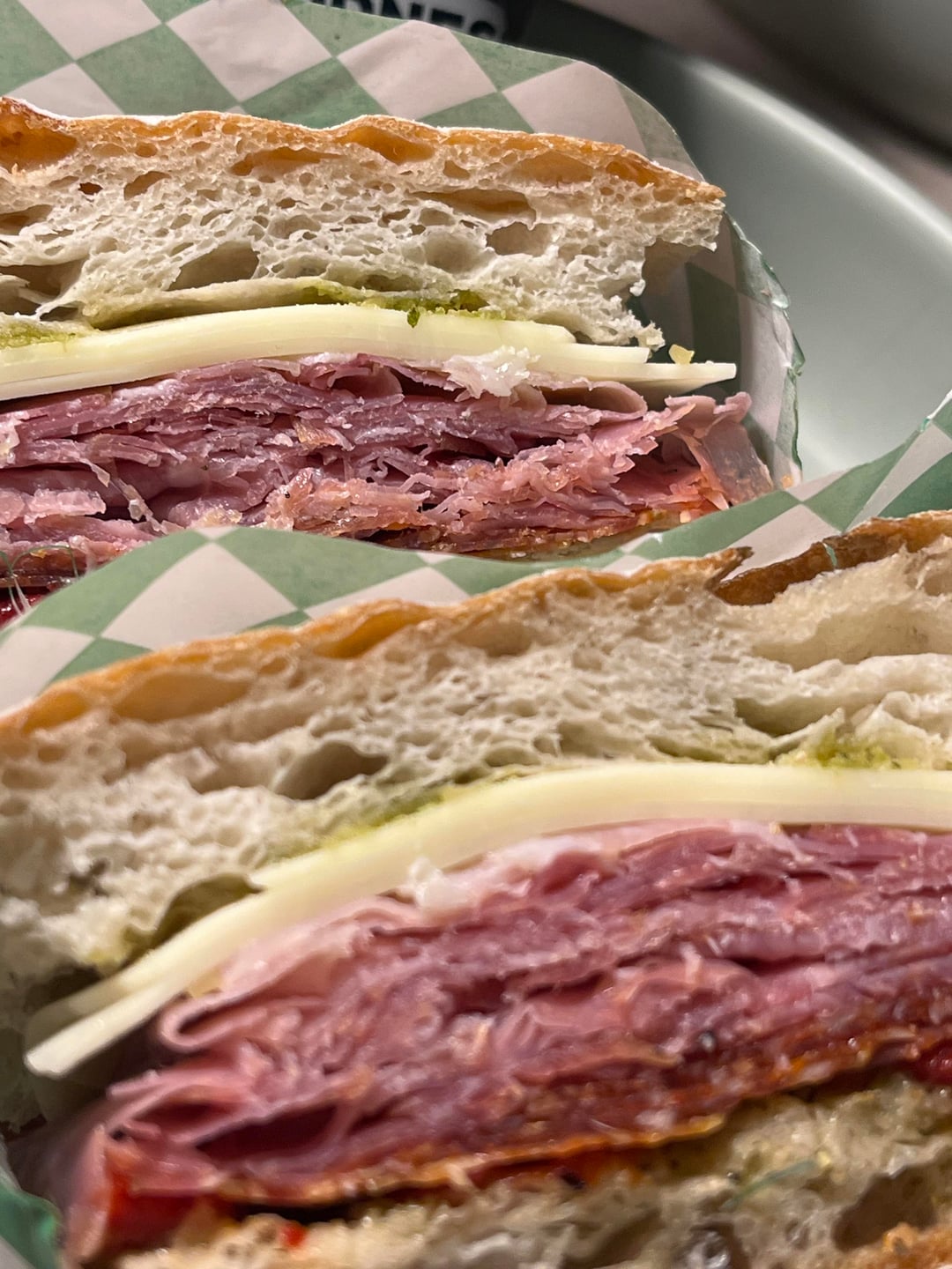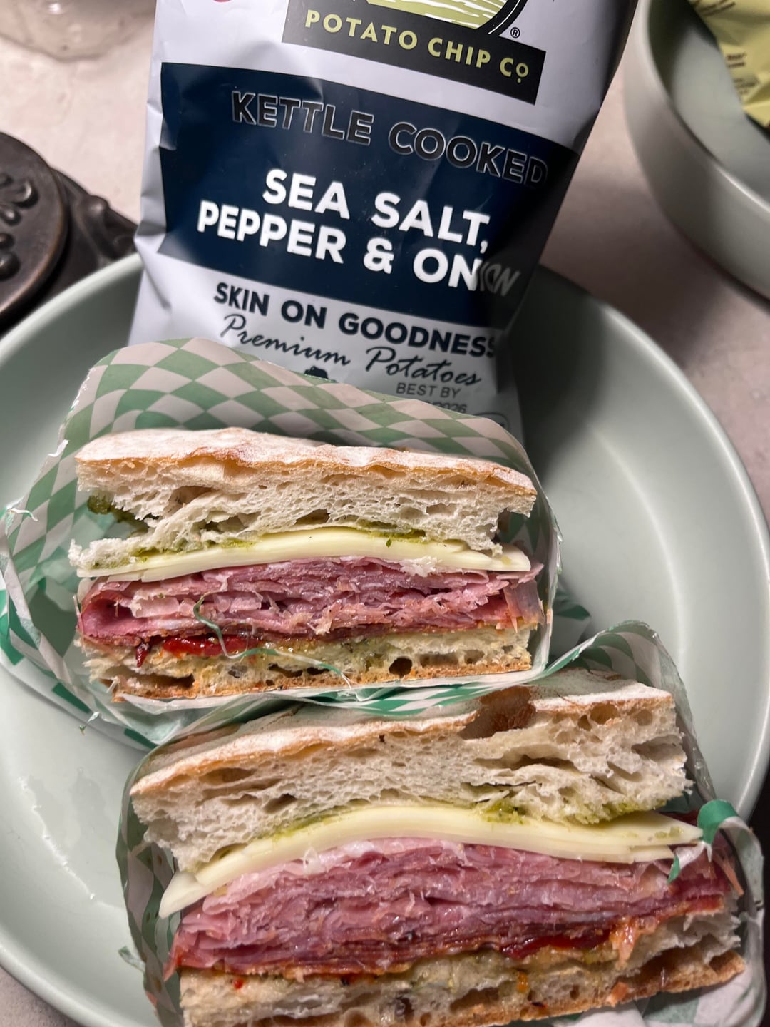 In an attempt to replicate a Folgarelli's Deli (NW Michigan) classic, tonight's menu featured "The Godfather" – crusty ciabatta bread, toasted, layered with fresh pesto, and topped with thinly sliced prosciutto, capicola, pepperoni, provolone cheese, roasted red peppers, a drizzle of olive oil and balsamic.