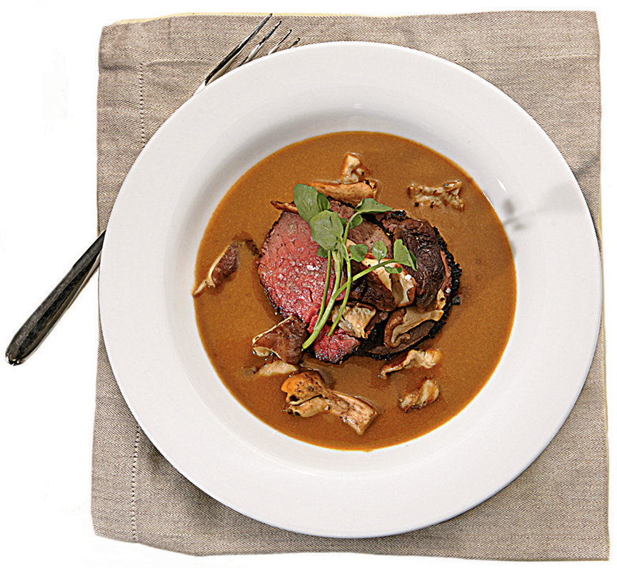 - Remove the twine and cut the beef into 1/2-inch-thick slices. Spoon just enough broth to cover the bottoms of 4 to 6 shallow, wide soup bowls. Add 2 to 3 slices of beef, spoon more broth over the beef if desired and top with mushrooms and watercress.