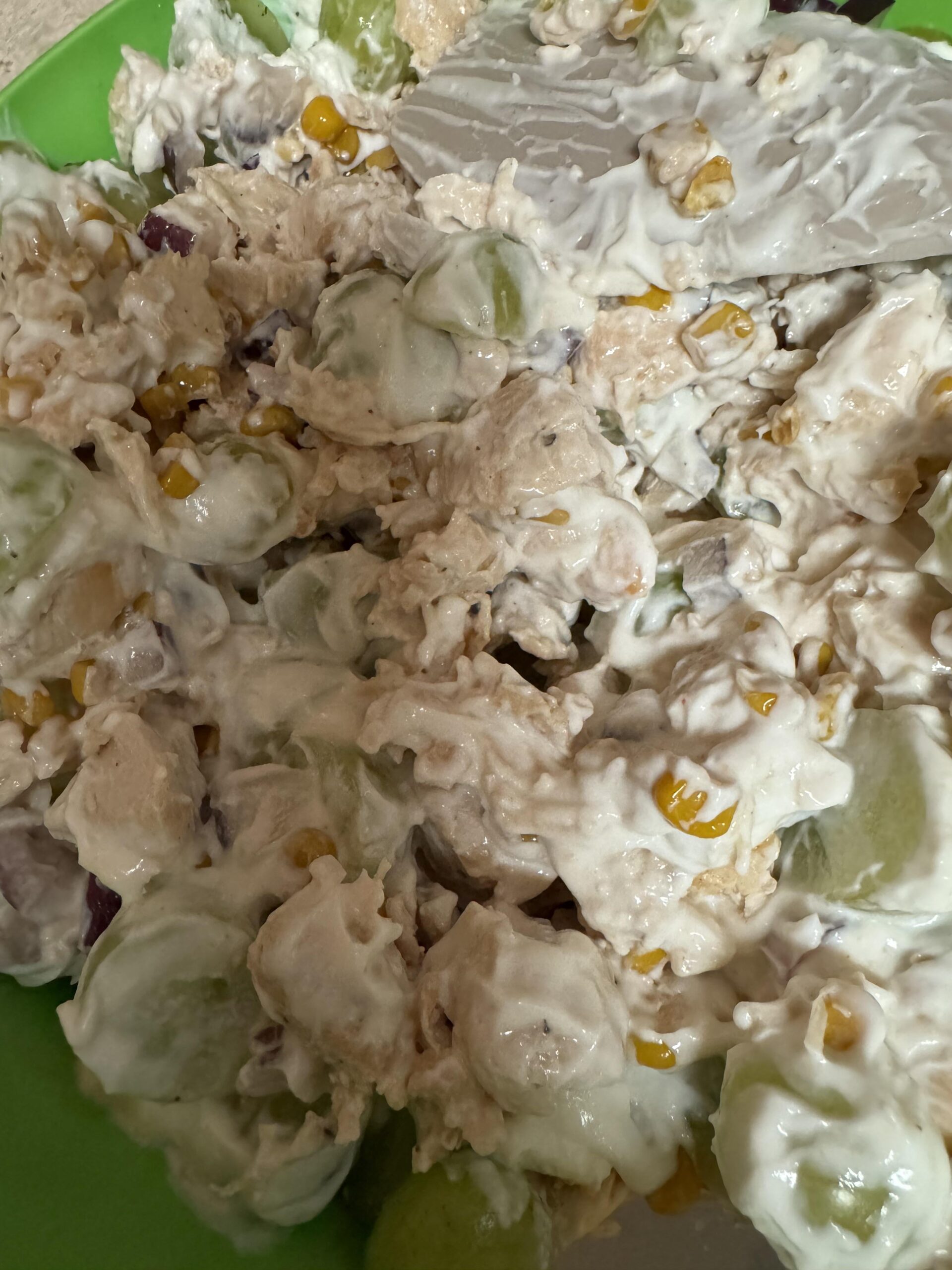 Cut a ton of green grapes in half and let the chicken plus corn cool. Mix grapes, chicken, and corn with plain Greek yogurt, a teaspoon of garlic, and half a diced red onion.
