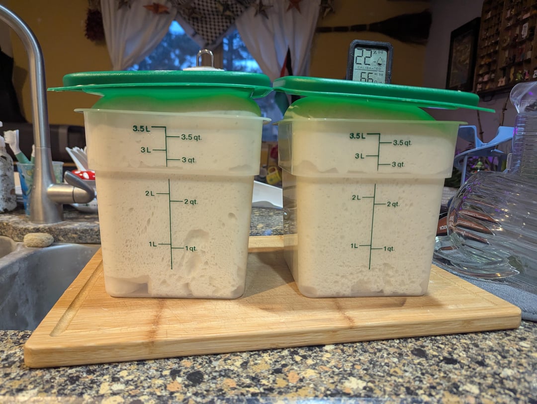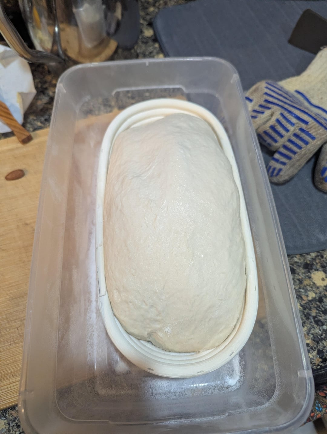 Pic 2 – 0645 the next morning and the temperature is 65. It has…more than tripled in size. It pushed the lids off the Cambros. By all measures, this should be over proofed. Nope. Not tacky at all, shaped like a dream. Put in the banneton and into the fridge.