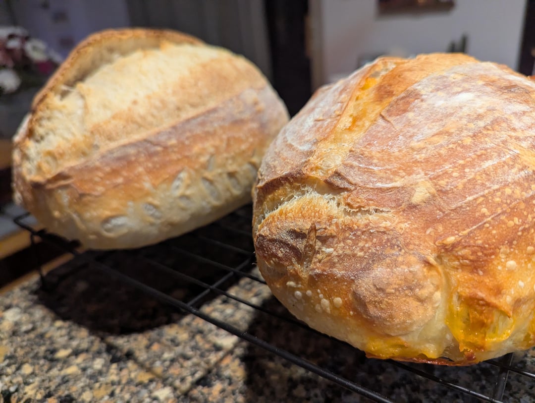Pic 6 – With its cheesey brother (which I dropped on the stove while transferring to the Dutch oven – didn't even phase it despite having a massive dent).