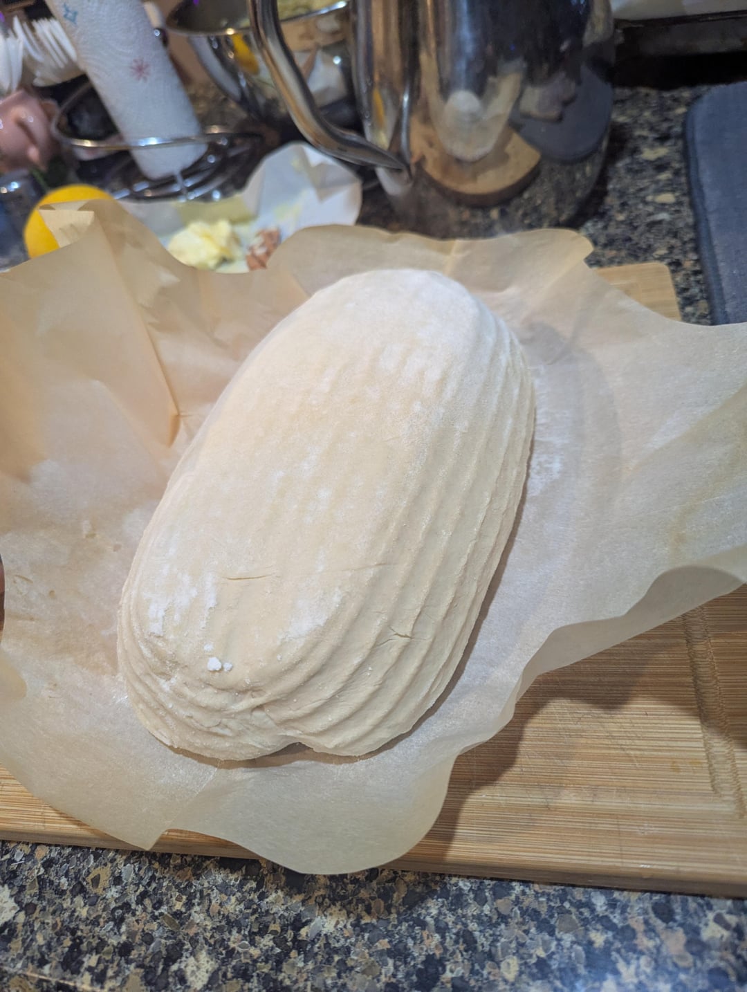 Pic 3 – End of the cold proof and it did in fact rise in the banneton.