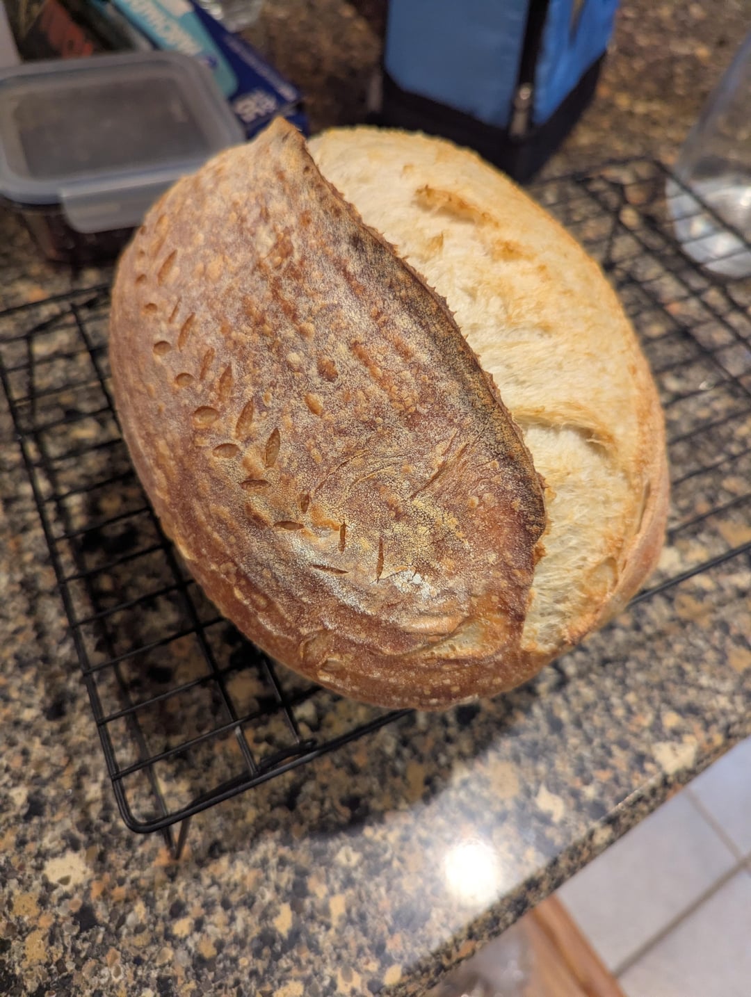 Today I made my loaves with 80% hydration and didn’t add the salt and the final 10% of water till after an hour of autolyze. The dough was nicer to handle. I found just a touch of water in my hand kept the dough from sticking. I may have folded and coiled a few too many to get the salt and water to combine, but after The bulk fermentation on my 73f heater floor at 4hrs exactly a poised and beautifully doubled dough that felt actively lighter and nicely moldable shaped well. I don’t have a fancy banneton or anything so I use a 12” square of parchment on an 8” plate and center my shaped dough then sort of craddle the dough with parchment and cover with a med-deep 6-7” mixing bowl over the top to hold a round loaf and stack in The fridge. This nicely transfers into the Dutch oven the next morning. In the past my process was to add the salt to all my water and starter before even adding the flour and my loaves always tasted amazing and baked so/so with a so/so+ oven spring. Hopefully we get a great oven spring now that the salt didn’t get to touch the starter directly and I fed the starter a little more diligently what felt like the proper period prior to making the dough, it seamed more perky than some of my past bakes!! lol this process is such a trip, I just love a slice toasted with butter regardless the outcome. Same on my starter, it was three – four months ago I plunged into the simple process of mixing standard filtered well water with flour and let it sit in the counter in a jar! It’s now a thriving culture of bliss. So easy.