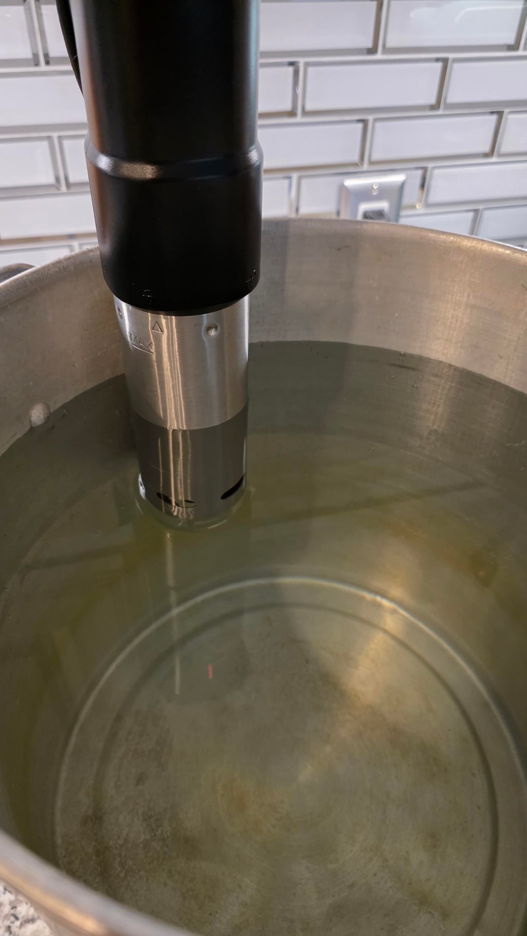 I primarily use a lobster pot with my SV work. It’s a great, and remember that bigger pots hold more latent heat, so it has an easier time maintaining heat after you add big pieces of meat. Ive done many tomahawks. Note that I cut the bone down a bit if it’s too long. Still looks amazing.