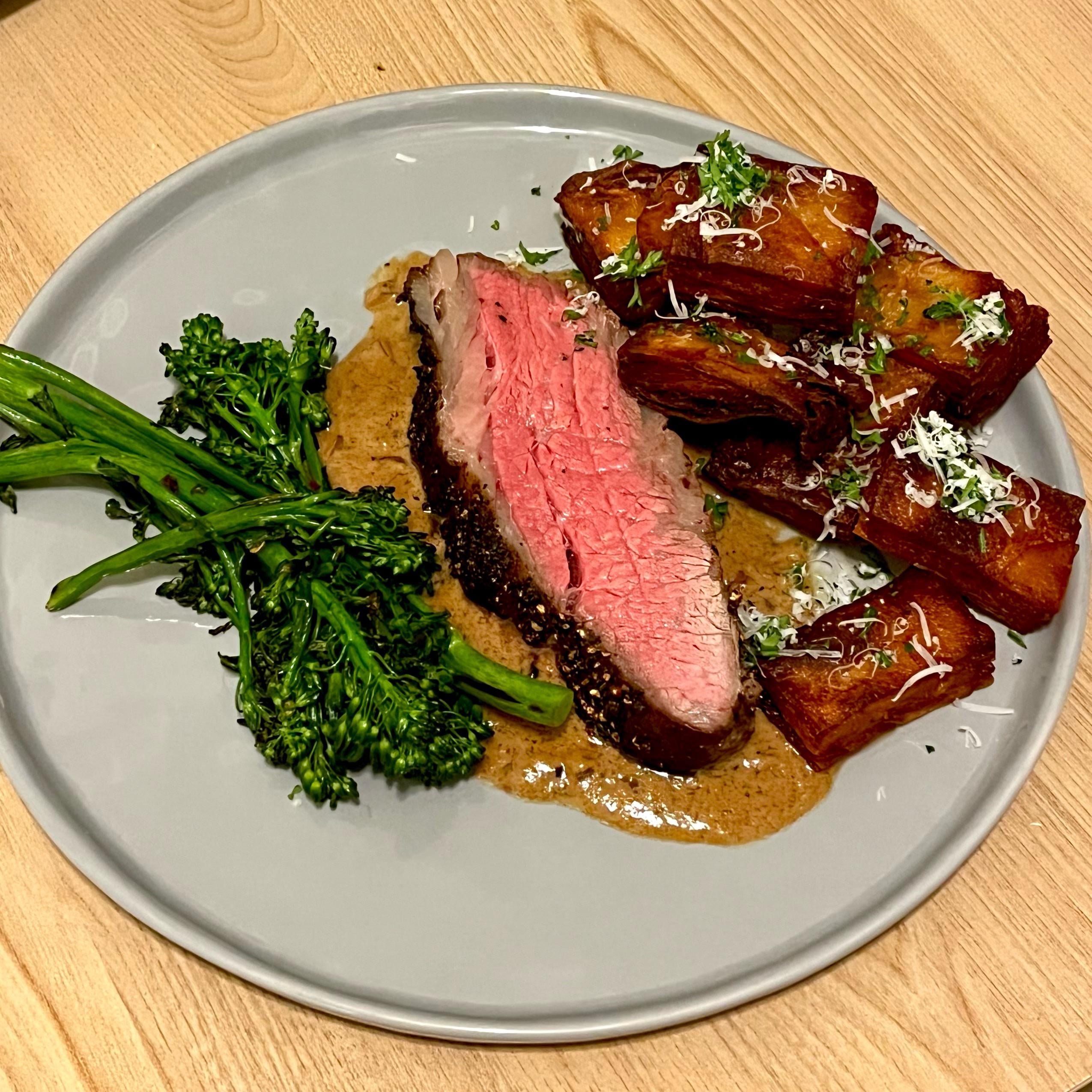 [Homemade] Tri tip au poivre with broccolini and potatoes pave