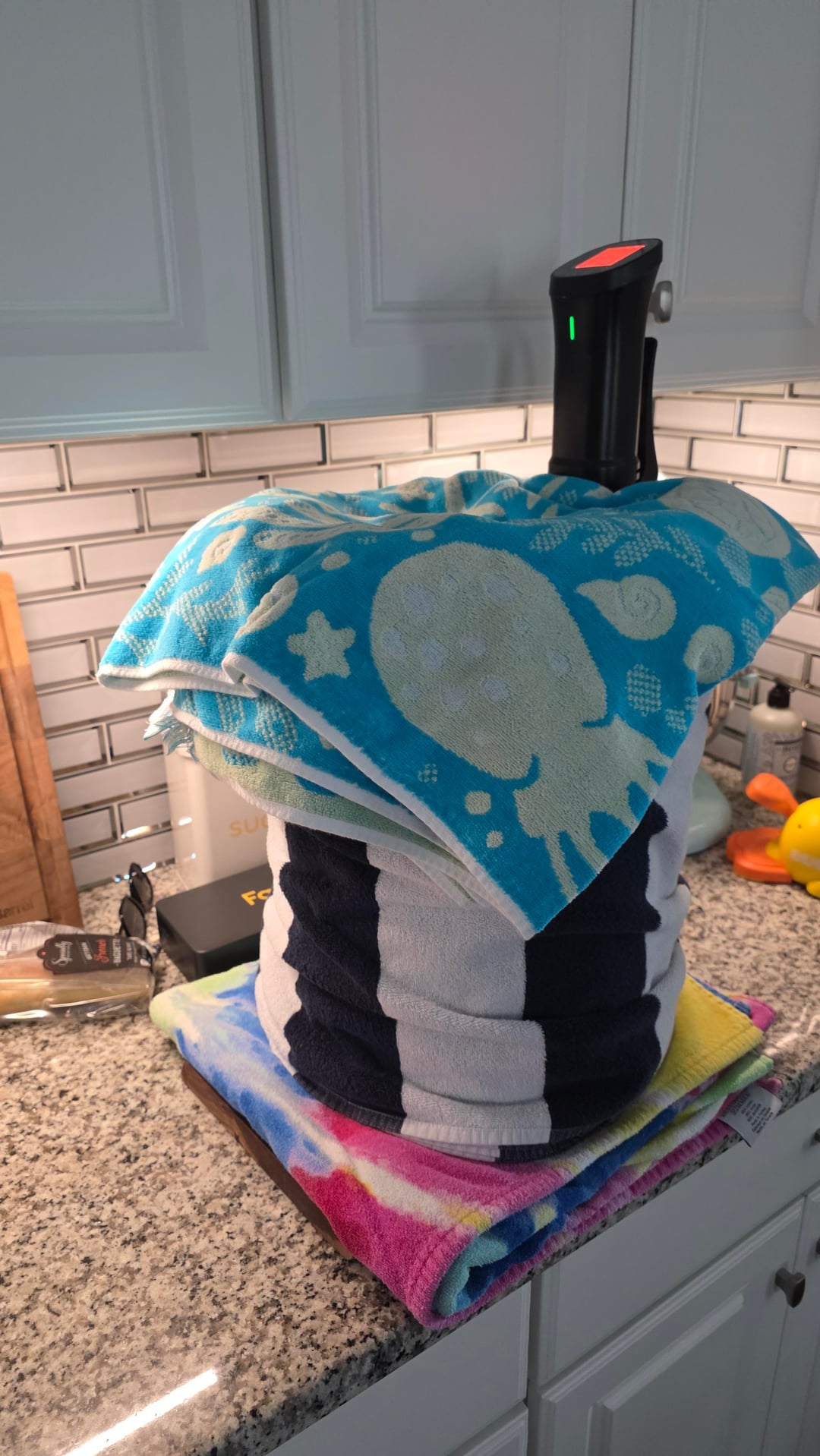 I placed a cutting board beneath the pot. I placed a towl between the cutting board and the pot. I wrapped the pot with towels. I covered the top with plastic wrap and another towel.