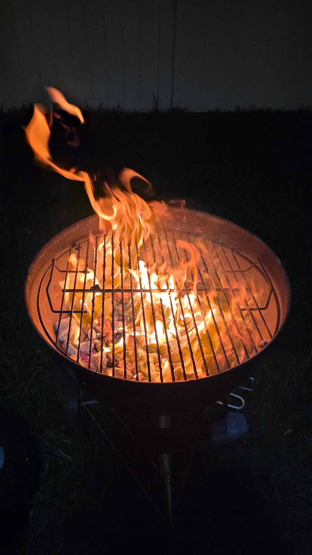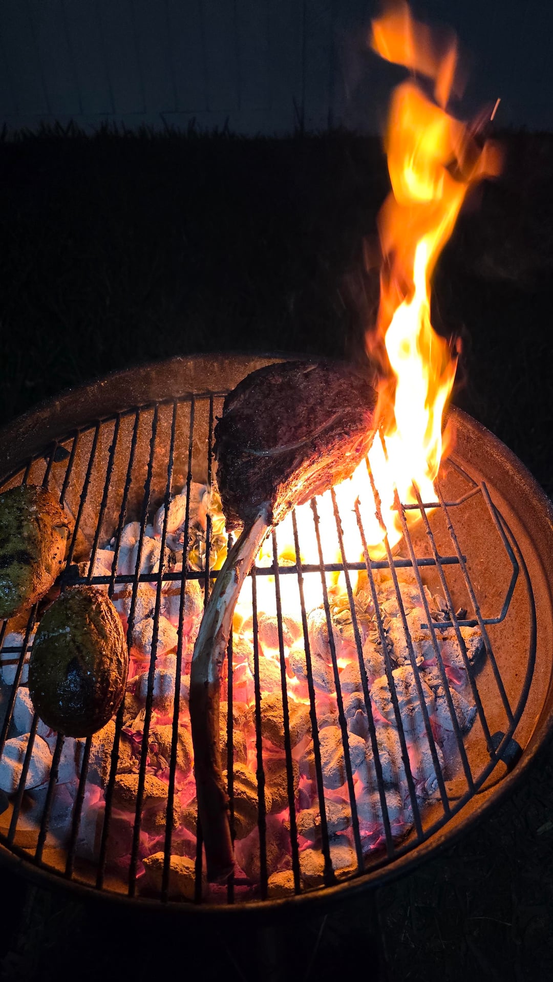 I poured a whole chinmey of coals in my small 18" Weber. I used my 18" instead of my 22" because the steak+bone fit, and I could concentrate the heat in a smaller area, making it WAY hotter. Just before I put the steak on, I threw a pile of Mesquite wood chips on the coals. I usually have chunks, but was all out.