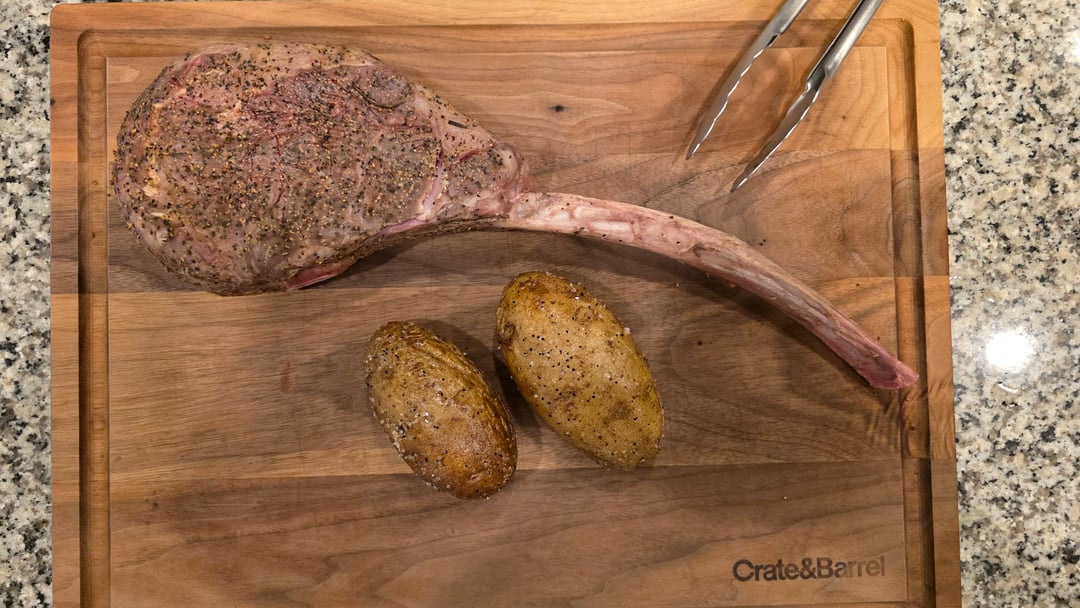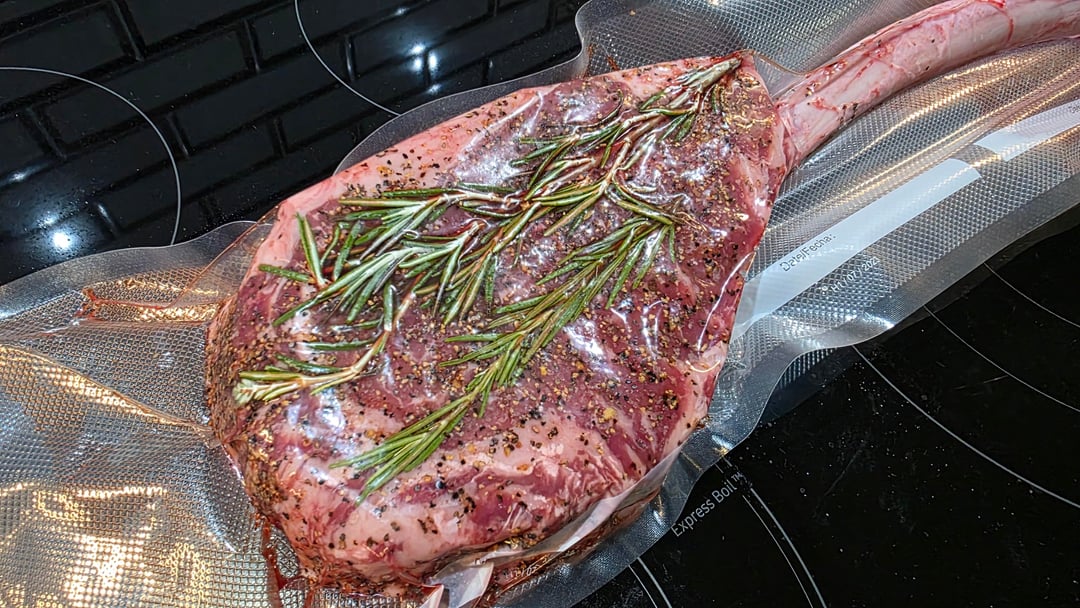 I removed the Tomahawk from its original wrapping, seasoned it with salt & pepper, added a few springs of fresh rosemary and resealed in my vacuum bag.