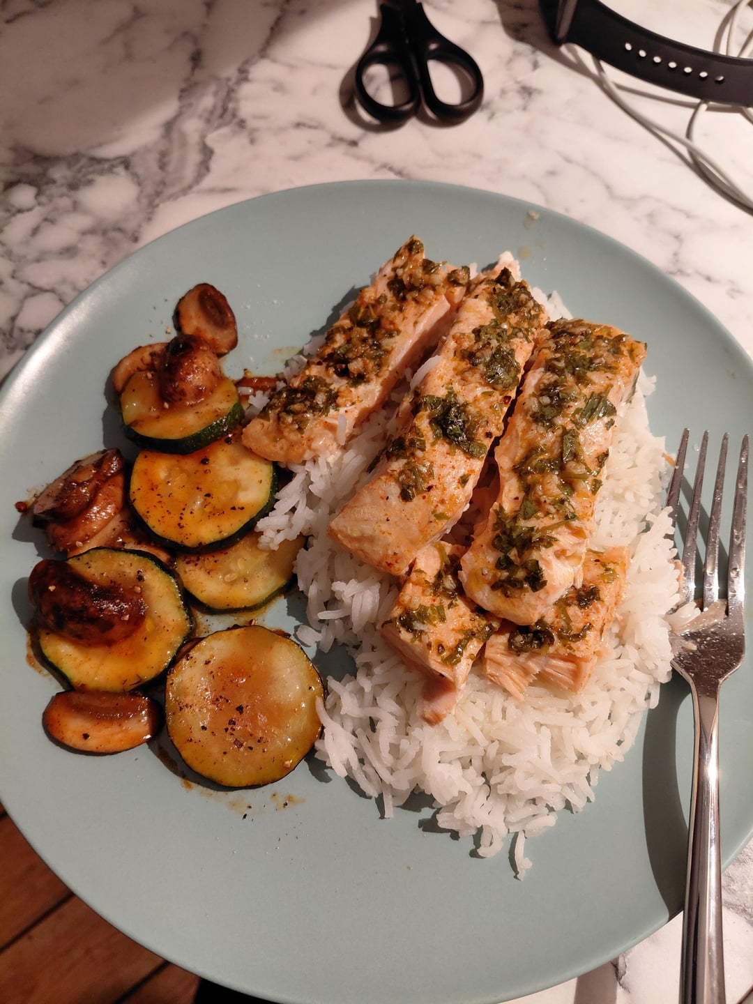 Chopped parsley, minced garlic, lemon juice, olive oil, salt, paprika and pepper mixed up well and coated all over the salmon prior to wrapping up in tin foil and putting in the oven. Served on bed of rice.