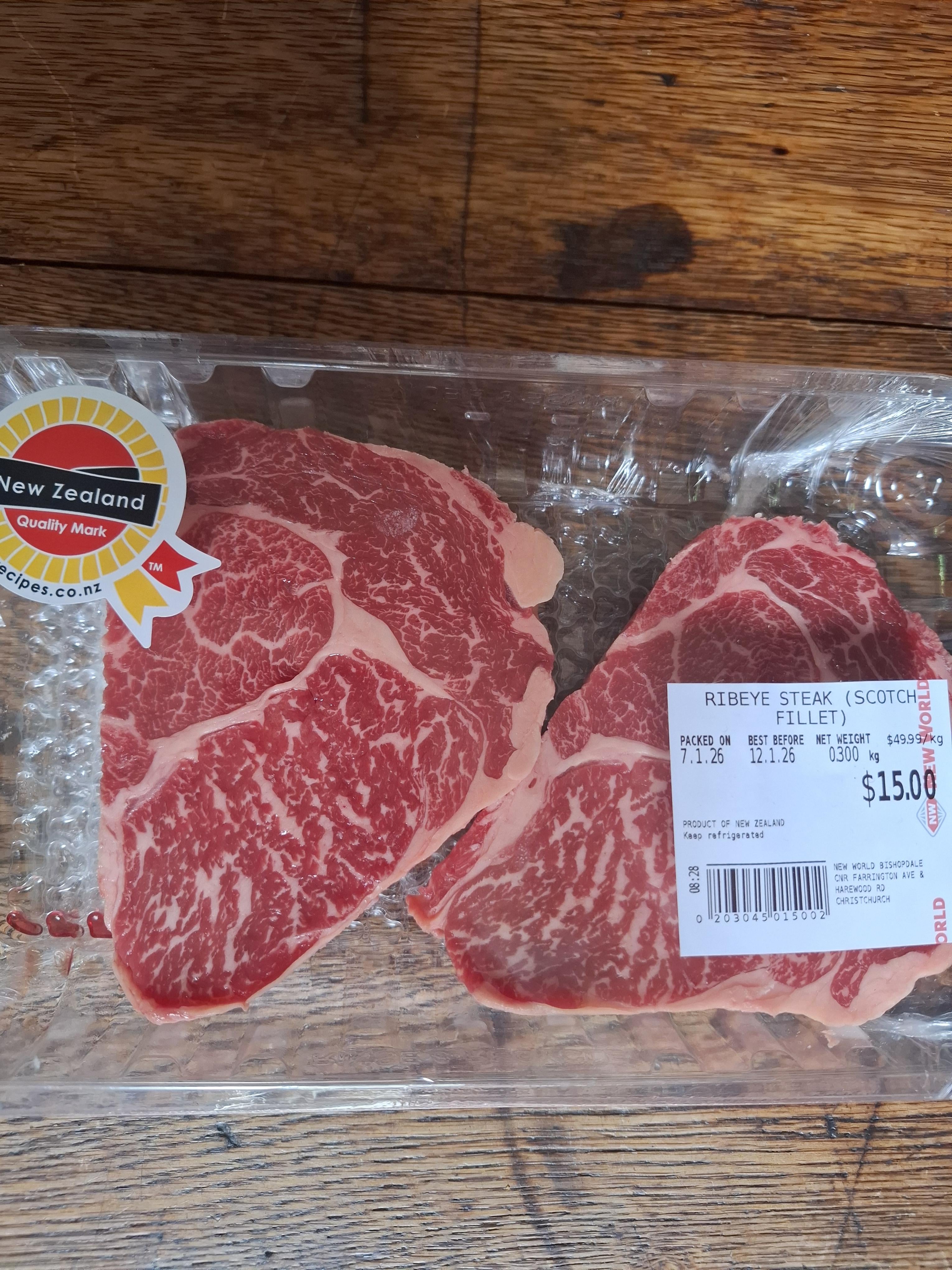 Ribeye? I question that. Nice marbling, but that cut doesn’t look like a ribeye steak to me.
