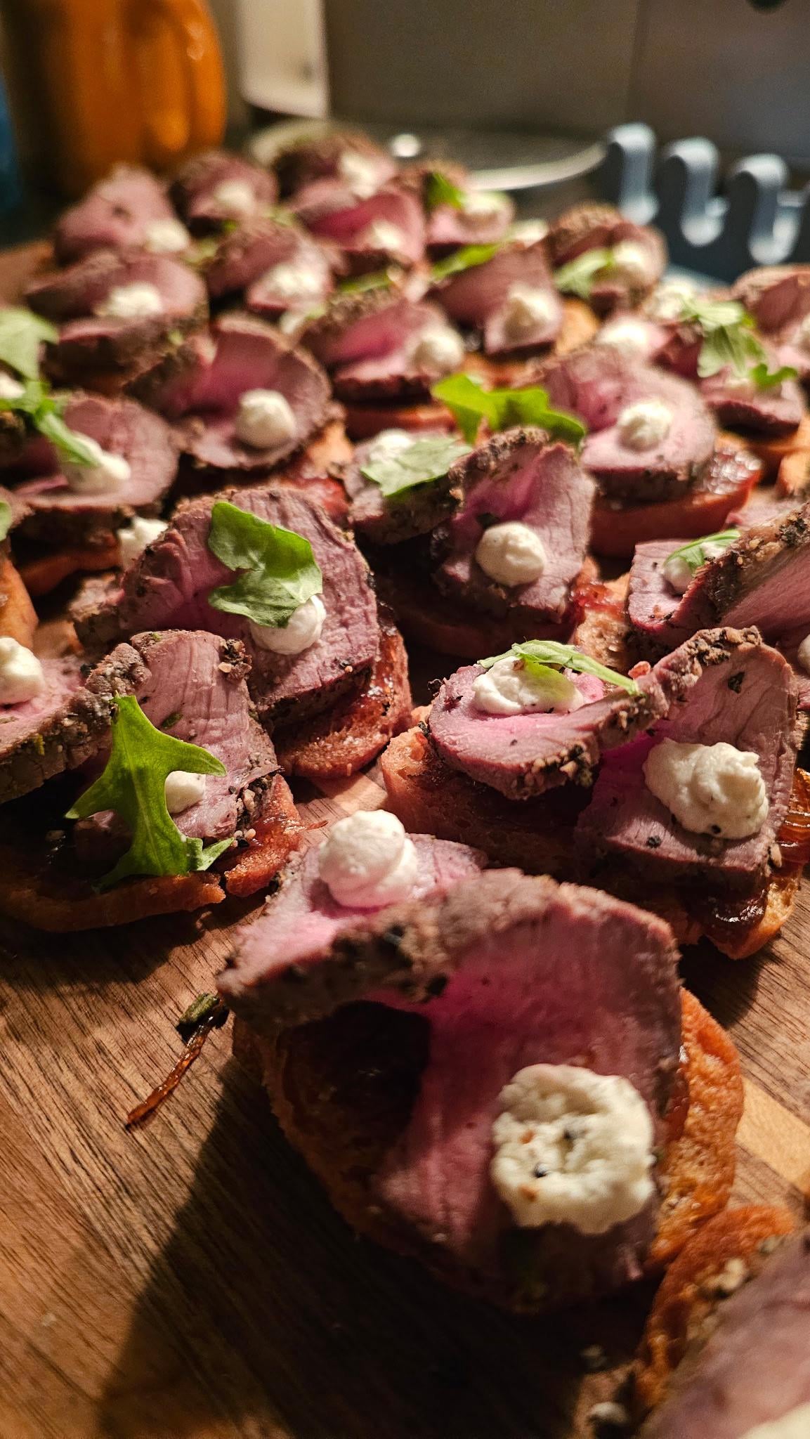 Crispy crostini with onion jam peppered roast beef, blue cheese cream and a sprig of arugula. Kinda proud:)by hindelburg Dining and Cooking