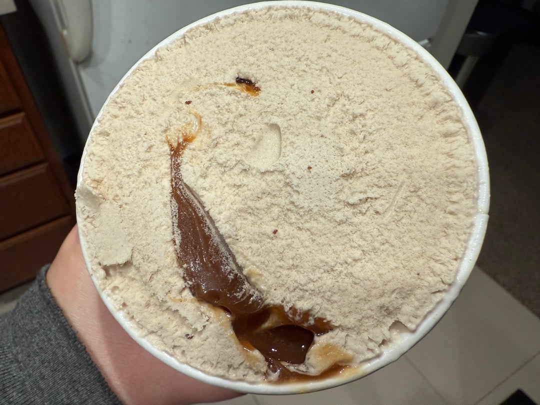 Agree the caramel seems soft, and can ooze slowly. I can only get the larger size near me. And I tend to scoop all (top to bottom) of a scoopable area at a time, so there is a big wall where caramel can puddle near if it’s exposed along that edge.