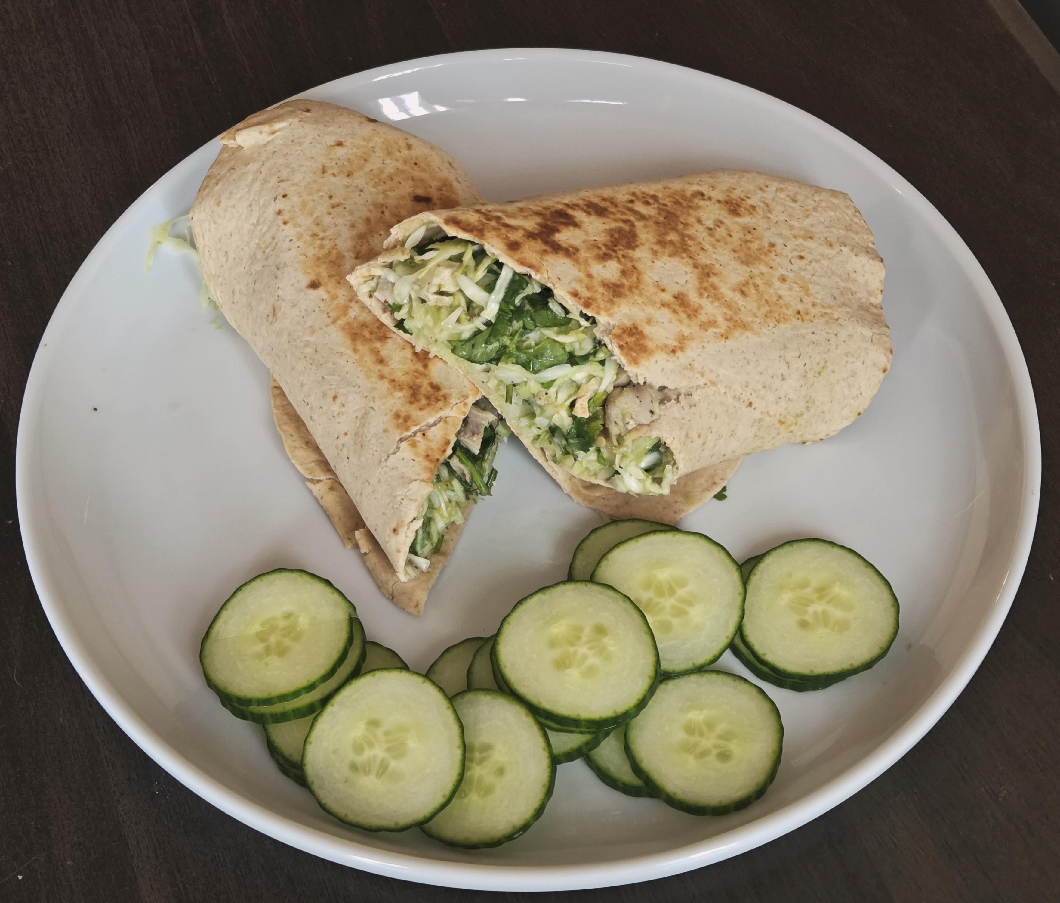 I'll gladly take the calories hit for boneless skinless chicken thighs. 518cals and 51g protein. Burrito is filled with air fried chicken thighs, shredded green cabbage, cilantro and guacamole ona Mission low carb tortilla and a side of sliced cucumbers.