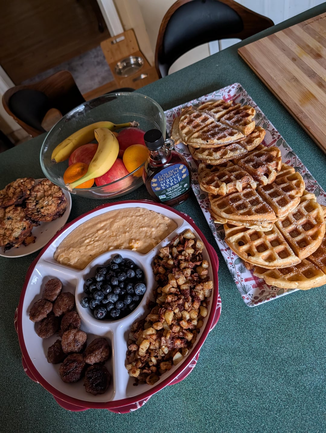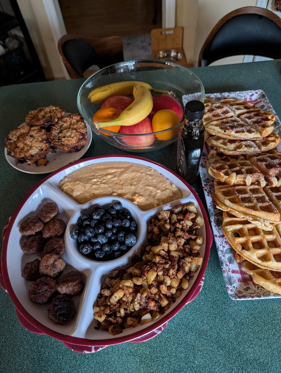 Waffles, mini maple sausages, cheese grits, potatoes, and blueberry muffins in the back.by Fit_Camp_1608 3 Comments Fuzzy_Welcome8348 3 days ago Looks fantastic!! Kevin-Durant-35 3 days ago Looks better than at a restaurant Plane-Monitor-7094 3 days ago WELL DONE 😋👍