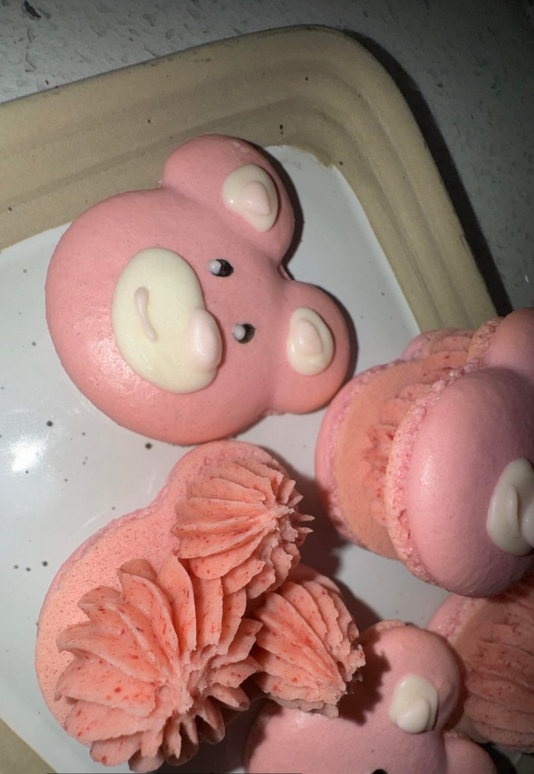 Practicing for Valentines. my pipping bags ran out mid way so i ended up using my plastic bagel bags lol but still ended up cute 🥰 i did a Berry Bear(strawberry buttercream), Oreo( oreo ganache), Late bear( Coffee mascarpone filling),& Chocolate (chocolate ganache).