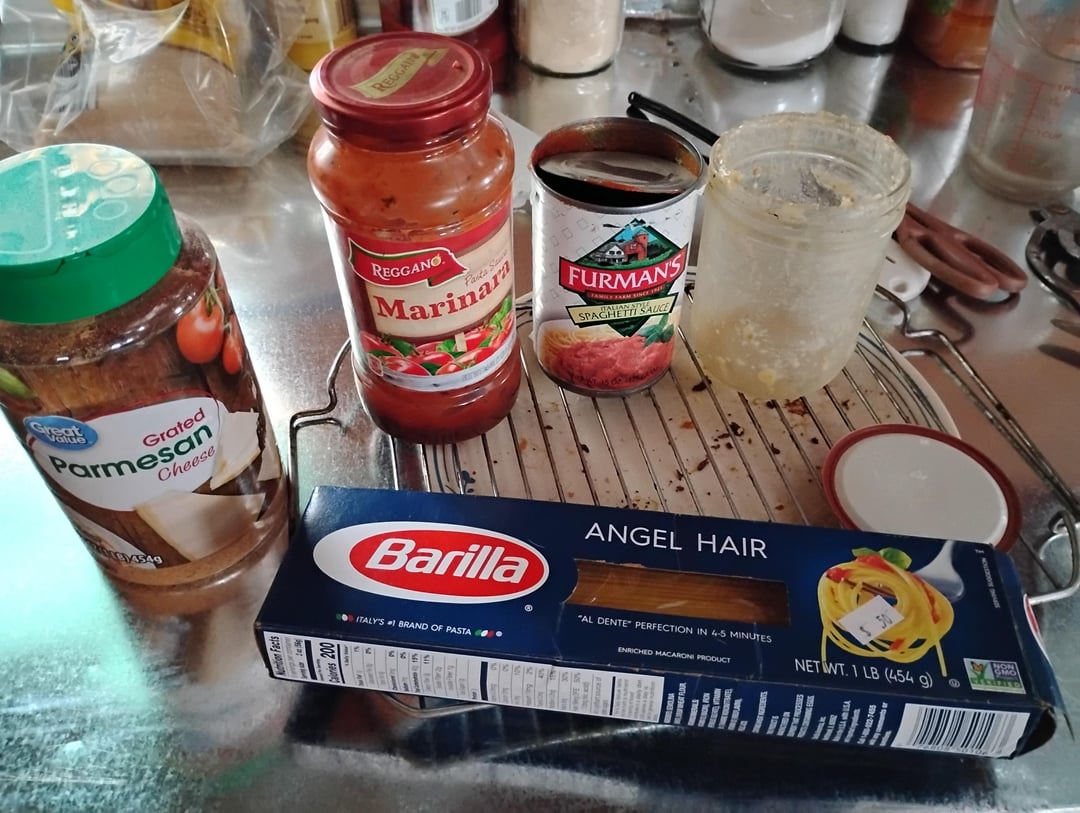 1 pint home canned Italian sausage, 1 jar Aldi's marinara, 1 can food pantry spaghetti sauce (got from someone who got if at fp then threw it out because it wasn't high quality stuff), angel hair pasta noodles i got on clearence in 2019 at Mennonite store, and opened a thing of Parmesan i bought years ago, and has since turned a dark brown sitting years in my pantry.