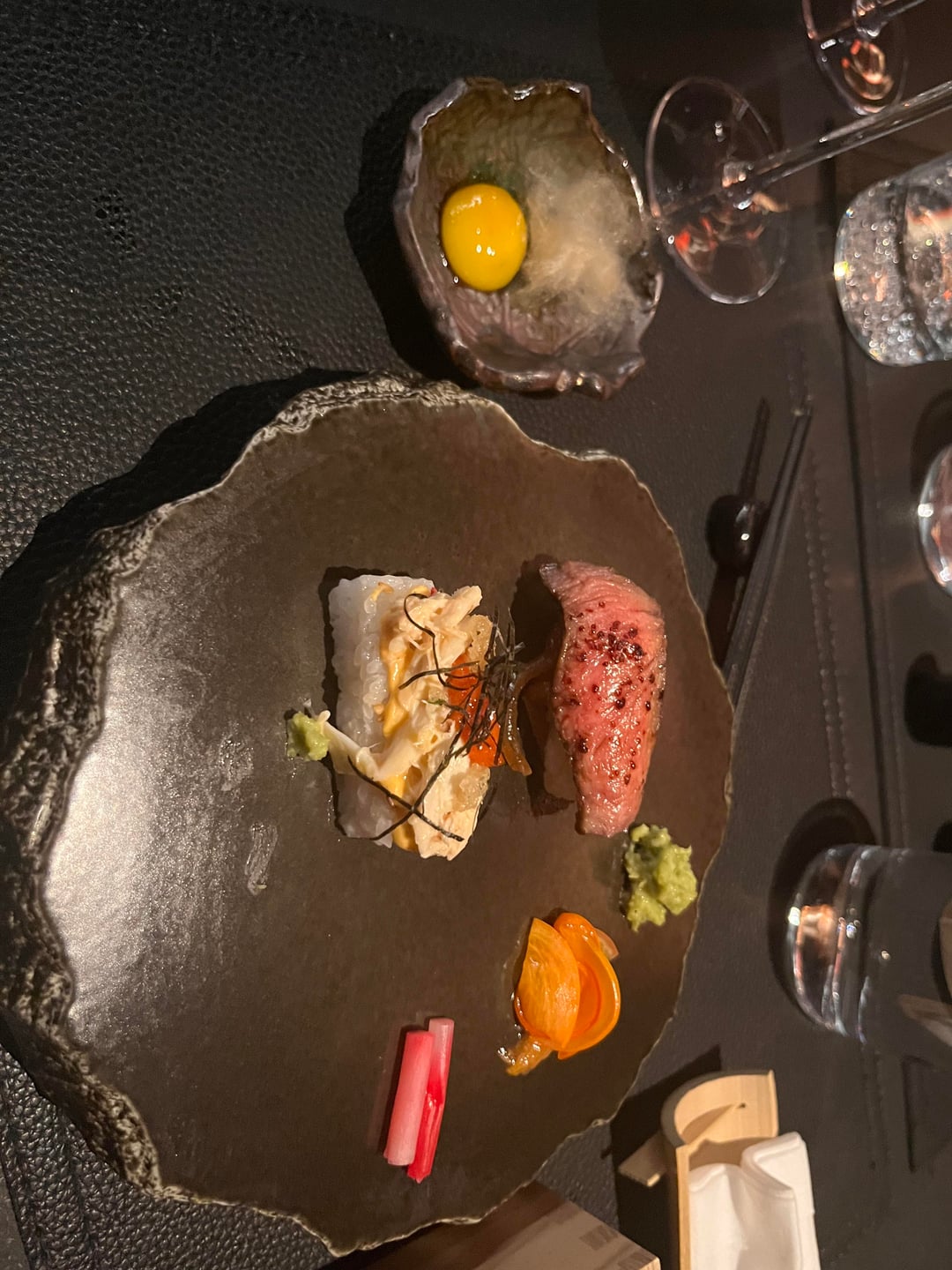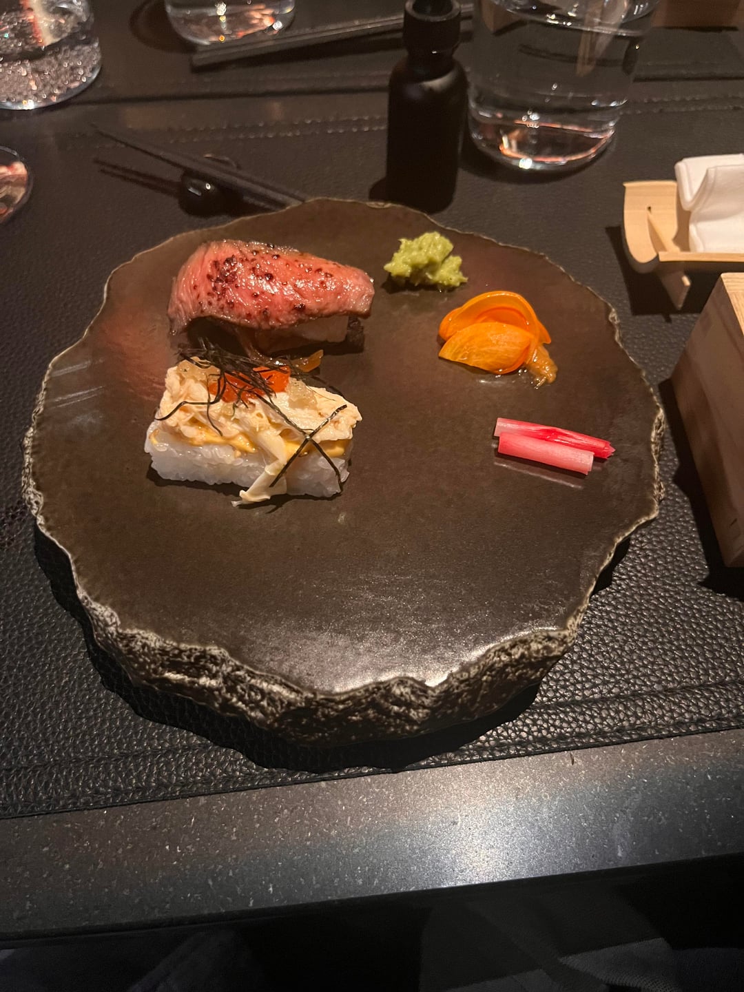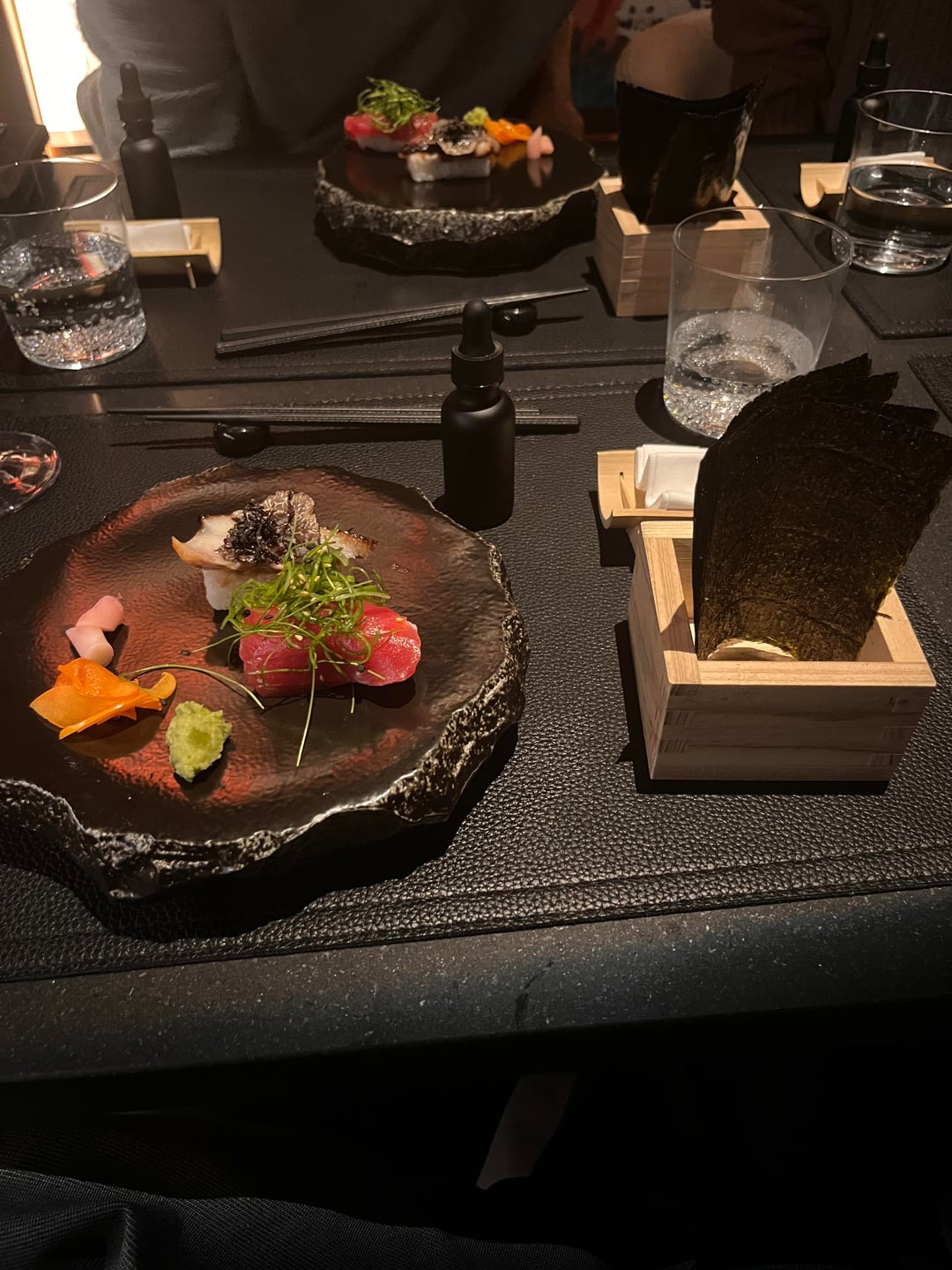 The only thing that didn’t blow us away was the dessert (as you can see I forgot to even take a photo of it). Matcha is never to my taste and this was no different. It was the best matcha dessert I’ve had but I still didn’t enjoy it . There was a chocolate truffle that was top tier but only one along with a jellied square and a vanilla macaron which wasn’t bad. Then an alcohol filled grape and pineapple that was good but again nothing mind blowing.