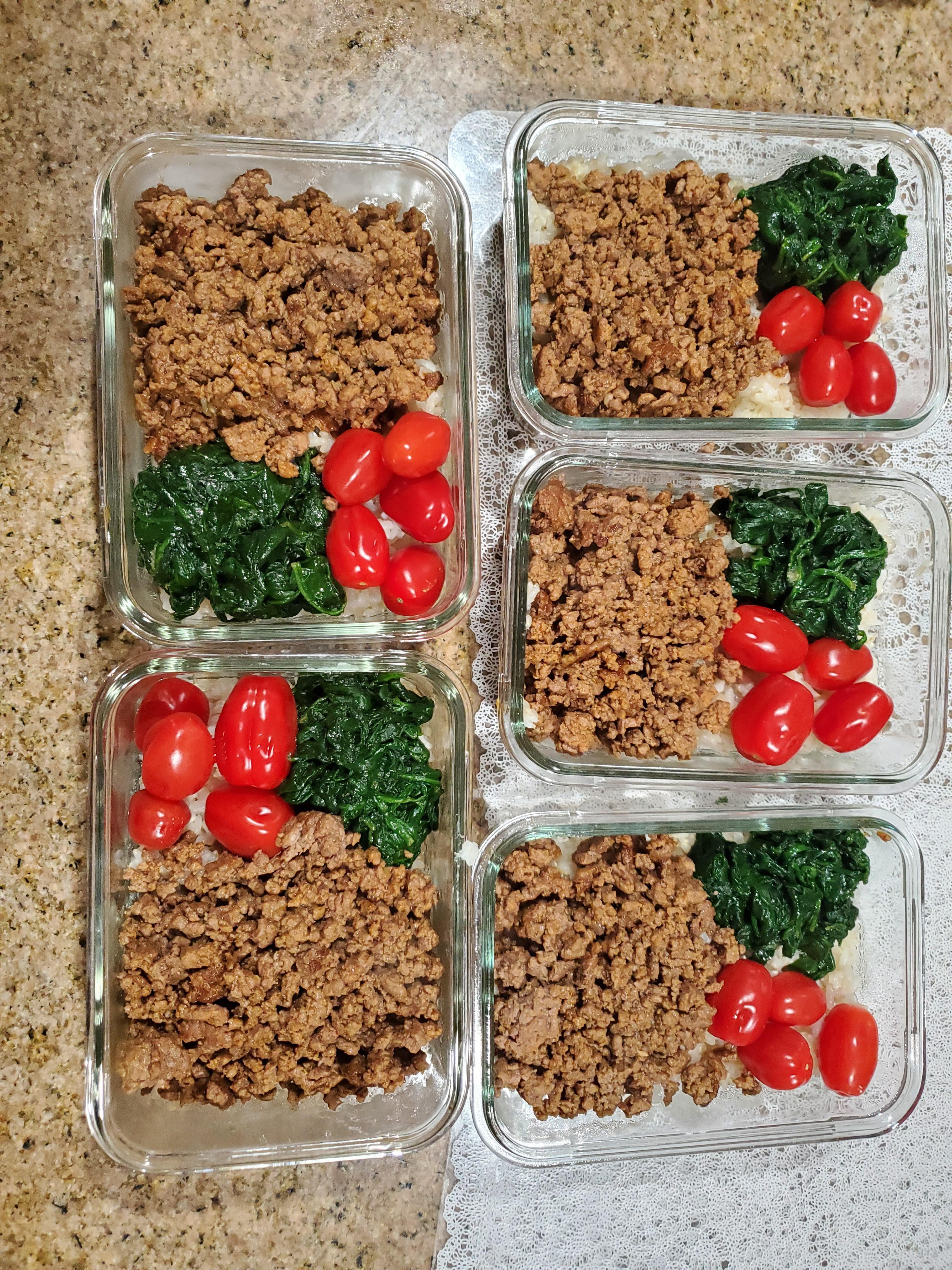 Ingredients: Ground beef, cherry tomatoes, baby spinach, brown rice