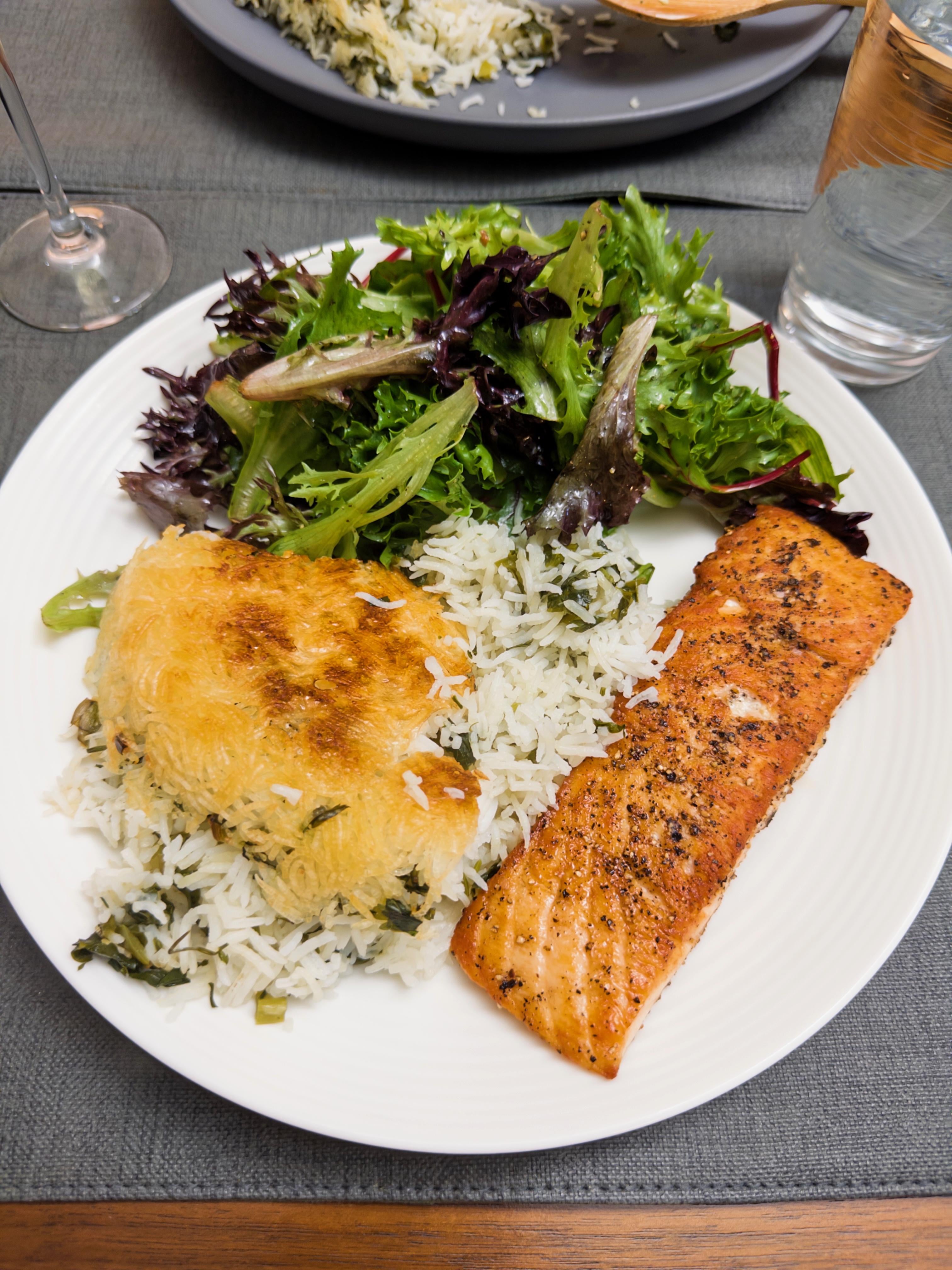 Salmon with Persian Rice by BaconToon 3 Comments BaconToon 2 months ago The Persian herb rice is called [Sabzi Polo](https://en.wikipedia.org/wiki/Sabzi_polo). The crispy rice from the bottom of the pan is called [Tahdig](https://en.wikipedia.org/wiki/Scorched_rice#Iran). Electrical_Lab300 2 months ago I want to eat too Umbroraban 2 months ago Looks delicious – I am cutting back on my salmon consumption – they way they farm the fish these days puts me. off…