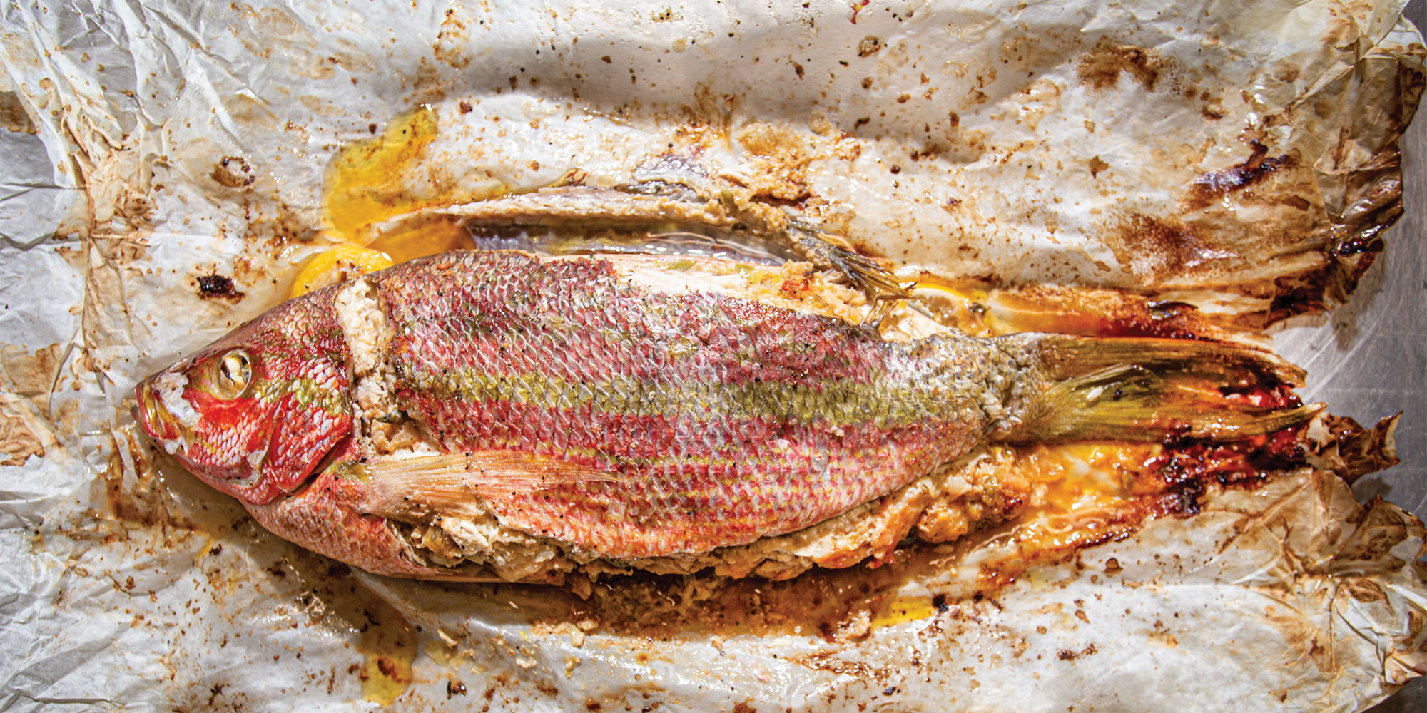 Lay fish onto parchment paper. Season gracefully with salt, pepper and olive oil. Small dice Andouille, onions, bell peppers and celery, and minced garlic. Mix eggs, Italian breadcrumbs and Parmesan cheese in a small bowl and reserve. Render Andouille in large saucepan (about 10 minutes), then sauté vegetables until translucent. Season with salt and pepper. Once all is cooked, stuff with thyme and stuffing and, in the parchment paper, lay on top of sliced lemons. Once fish is stuffed, roll stuffed fish with parchment paper until enclosed. Top with sliced pieces of butter, pouring the white wine on top of the fish. Wrap tightly and bake in hot oven at 350 degrees for about 40 to 50 minutes until internal temperature is 165 degrees.