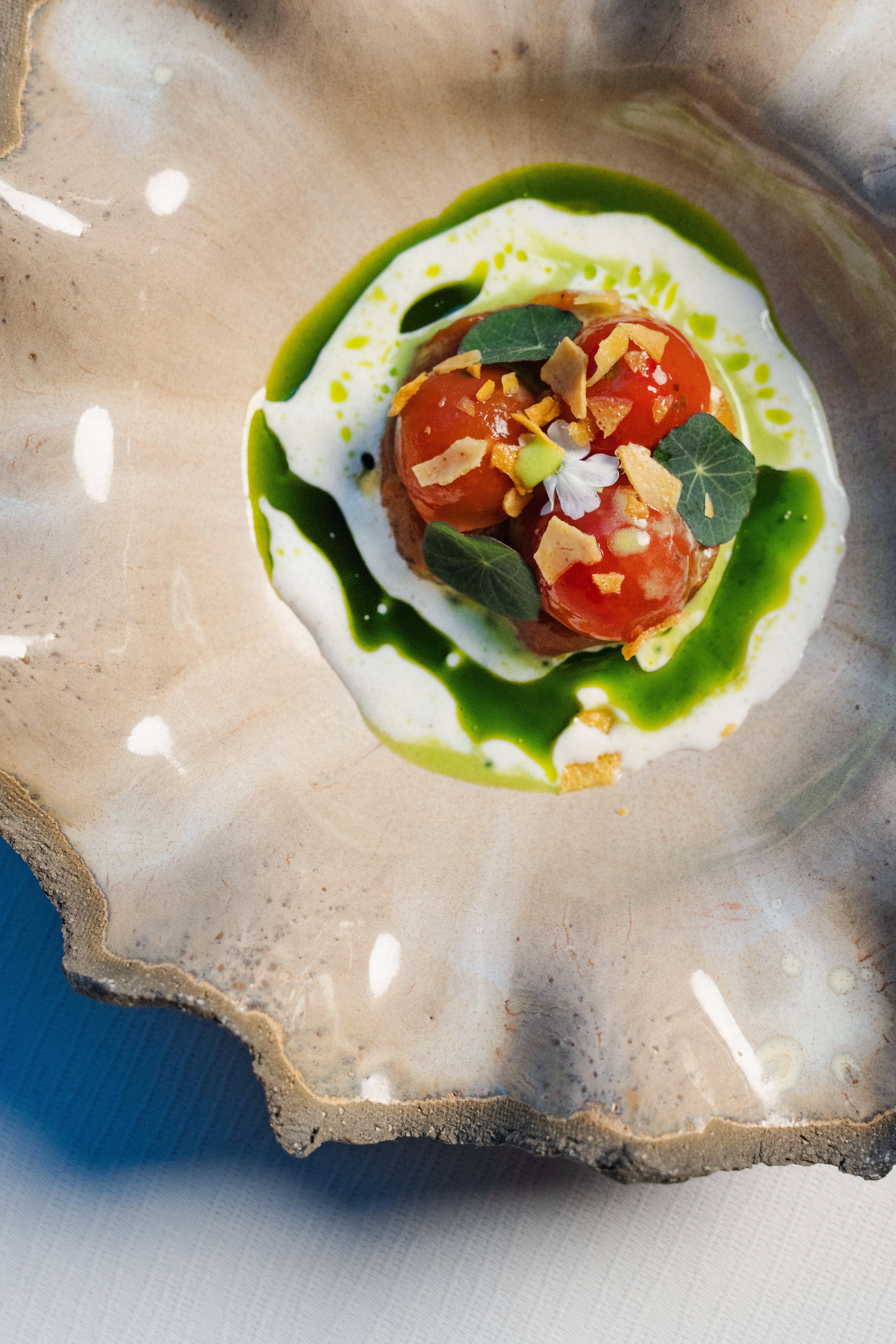 Before guests are seated at their table they can enjoy three new canapes in the Ossiano lounge, including an oyster shell biscuit topped with steamed oyster and jalapeño sauce, accompanied with oyster spherification, and finished with black garlic gel and tarragon gel; a fried buñuelo filled with créme fraiche topped with dry aged tuna tartar with kimchi sesame, finished with kristal caviar; as well as a croustade filled with smoked salmon and onion cream and finished with seawater-infused kohlrabi disc with kohlrabi oil.