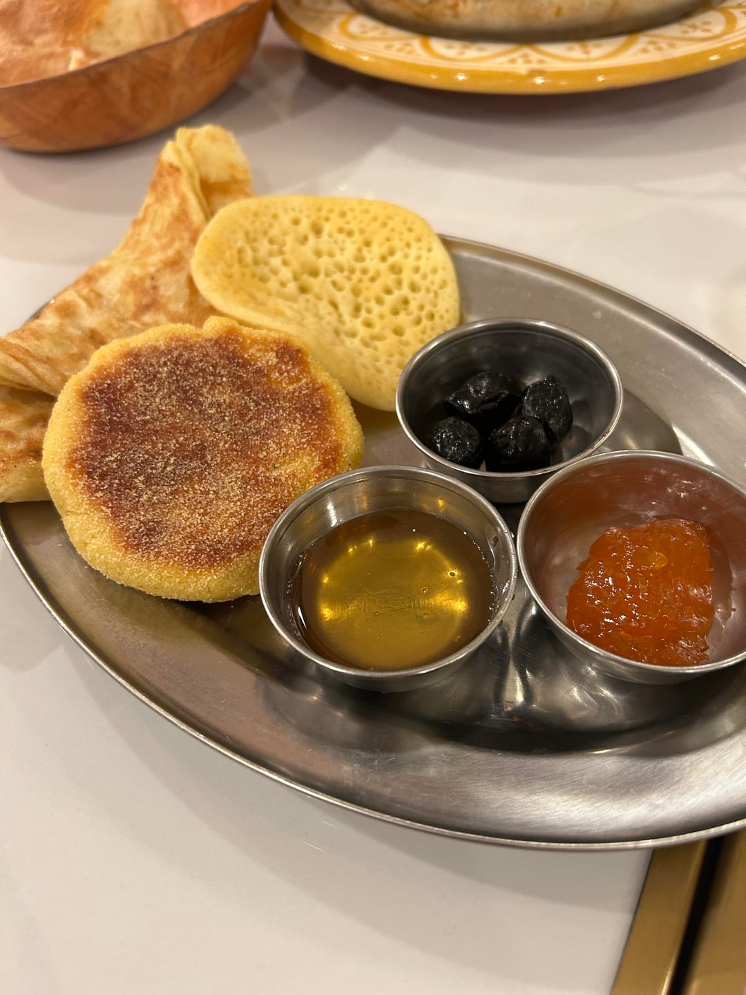 The eggs were cooked and seasoned perfectly, the potatoes were garlicky and a great texture, and the three different moroccan breads came with honey, excellent dried black olives, and a jam that I think was orange with a bit of rose water.