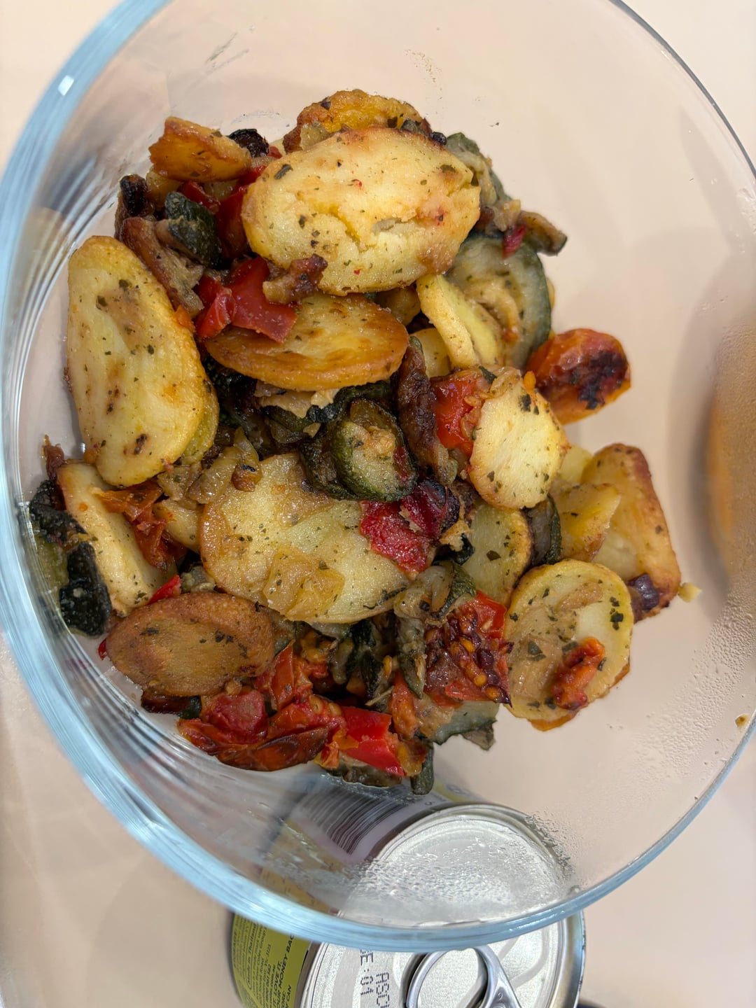 Lunch: roasted veg, tin of tuna, homemade tomato soup with cottage cheese for extra protein (not pictured)