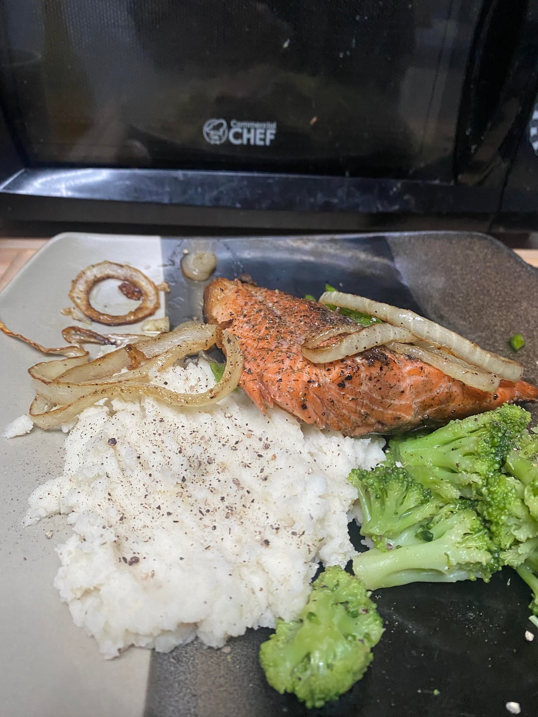 Little bit sautéed onions, steamed broccoli and mashed taters.