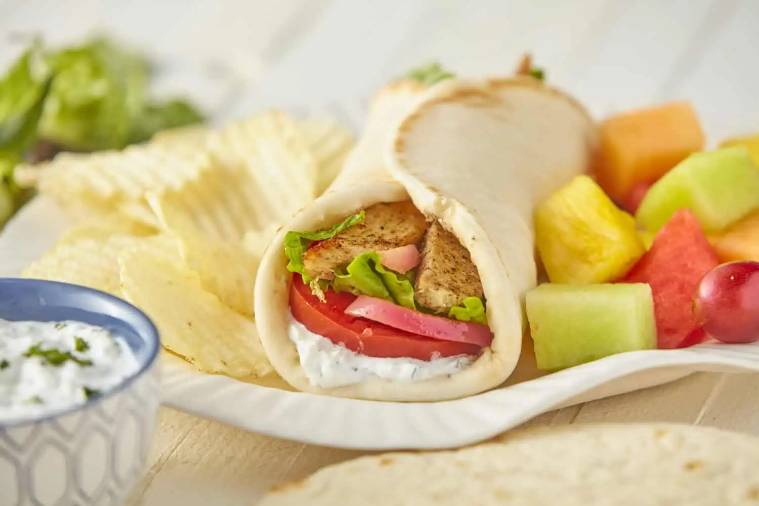 A Street Gyro is made with charbroiled shaved beef and lamb, sliced tomato, red onion, and Taziki sauce on a griddled pita. Each meal includes a gyro, chips and your choice of a side, including pasta salad, fresh-cut fruit, tomato cucumber salad, roasted potatoes or basmati rice.