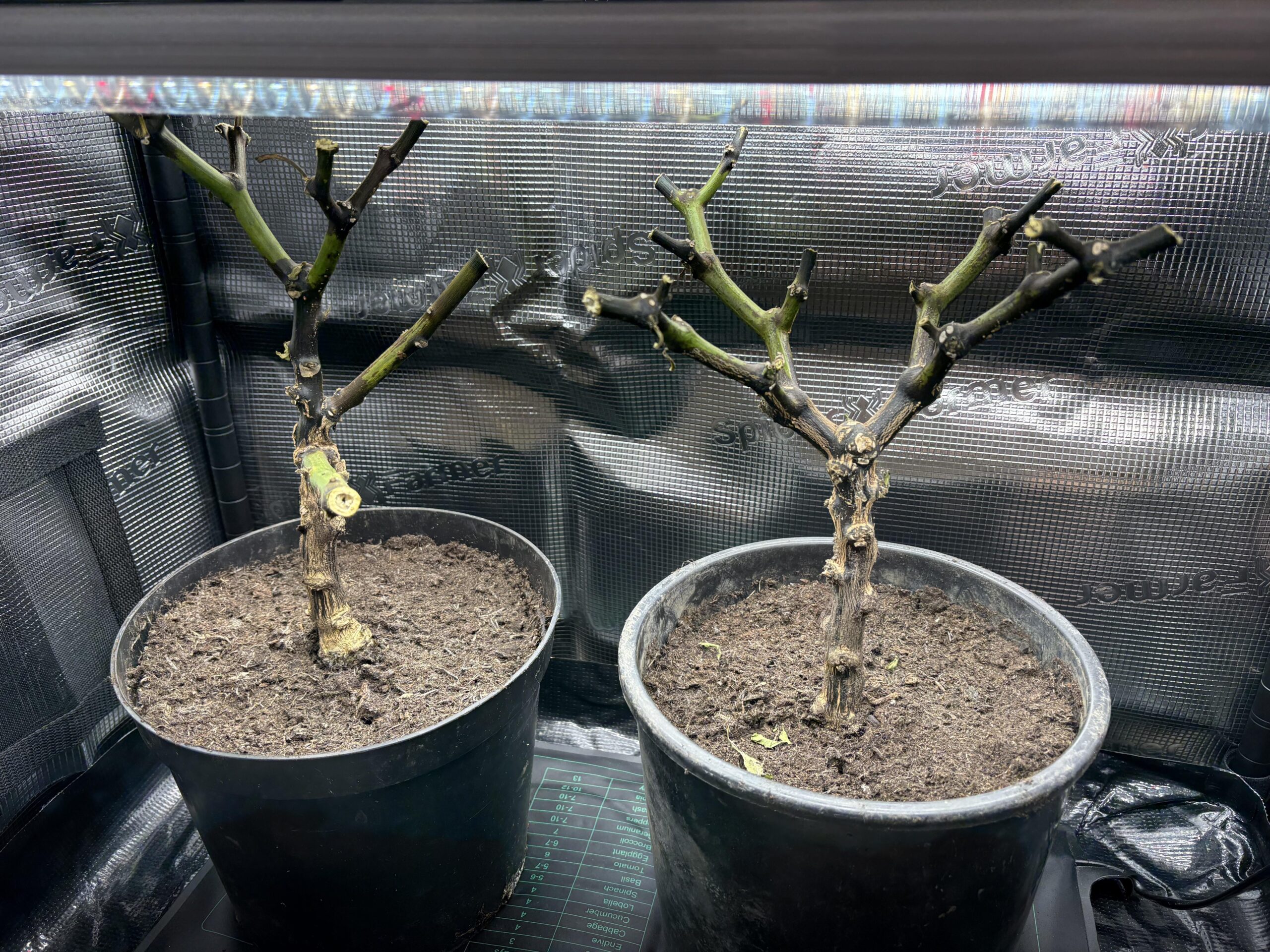These were pruned, dug up, roots cleaned and potted up into the attached garage since early November. My new propagation tent arrived this week so thought I’d pop them into there. Is this how they normally look after a stint in the garage? The black colour is random, would have expected to have seen it starting from the twig ends and work its way down but seems sporadic. Any hope?